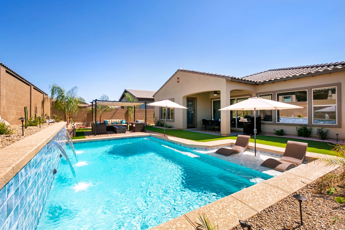 Experience refined comfort at this beautiful Goodyear retreat. Relax in the private backyard oasis with a sparkling pool, hot tub, and BBQ setup. Inside, enjoy 3 spacious bedrooms, 2 modern bathrooms, and a fully equipped kitchen perfect for family meals or entertaining. Close to top golf courses, the Goodyear Ballpark, and Phoenix attractions, this home is ideal for golf trips, family getaways, or group stays. Make memories poolside and indulge in the best of Arizona living.