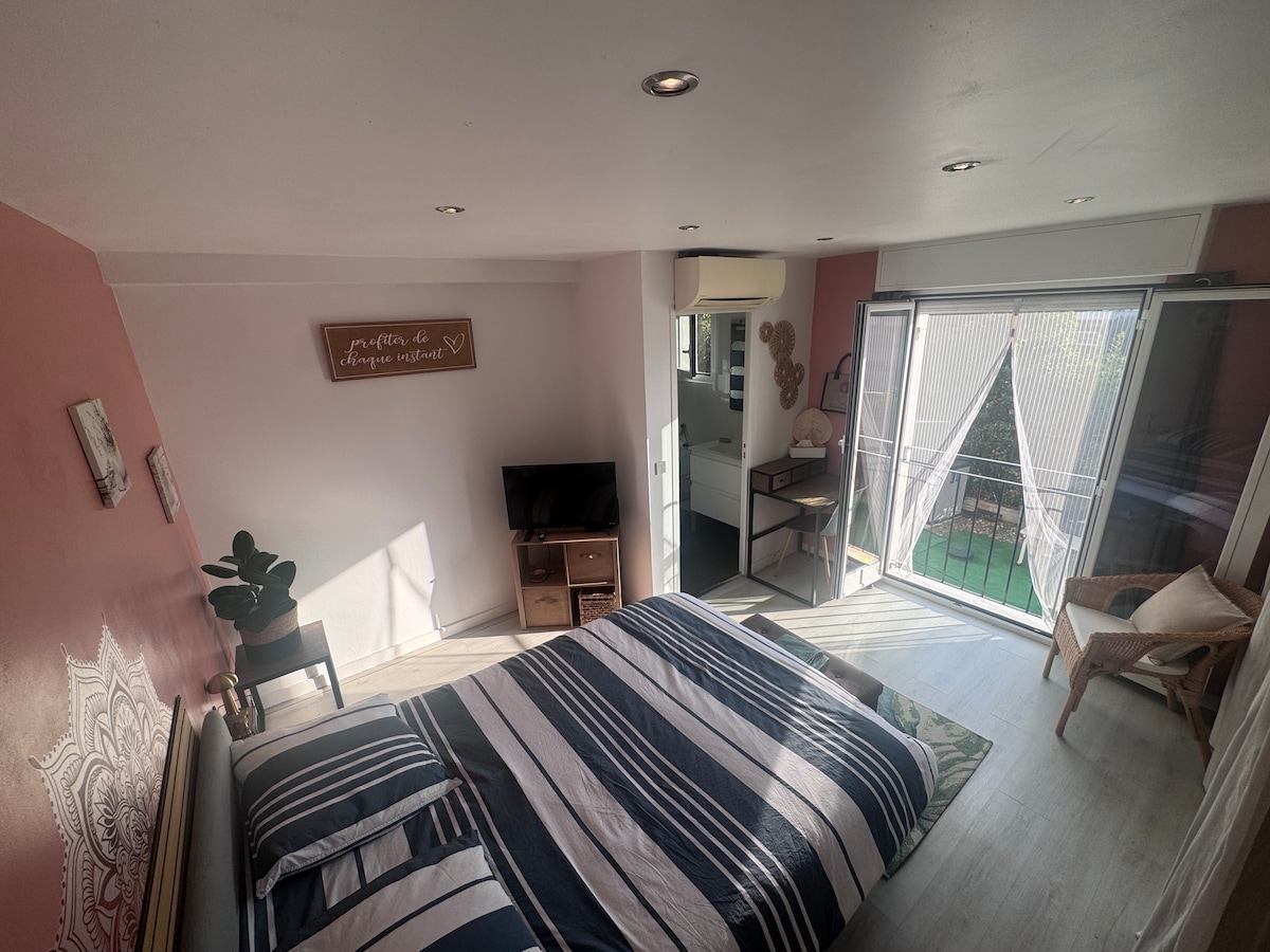 A 12 minutos a pie del Palacio de Festivales, disfrutará de un apartamento independiente de 32 m², en la planta baja de una casa con jardín que goza de la tranquilidad de una calle transversal. Reformado, con todas las comodidades, con terraza independiente. Cerca de todos los comercios.