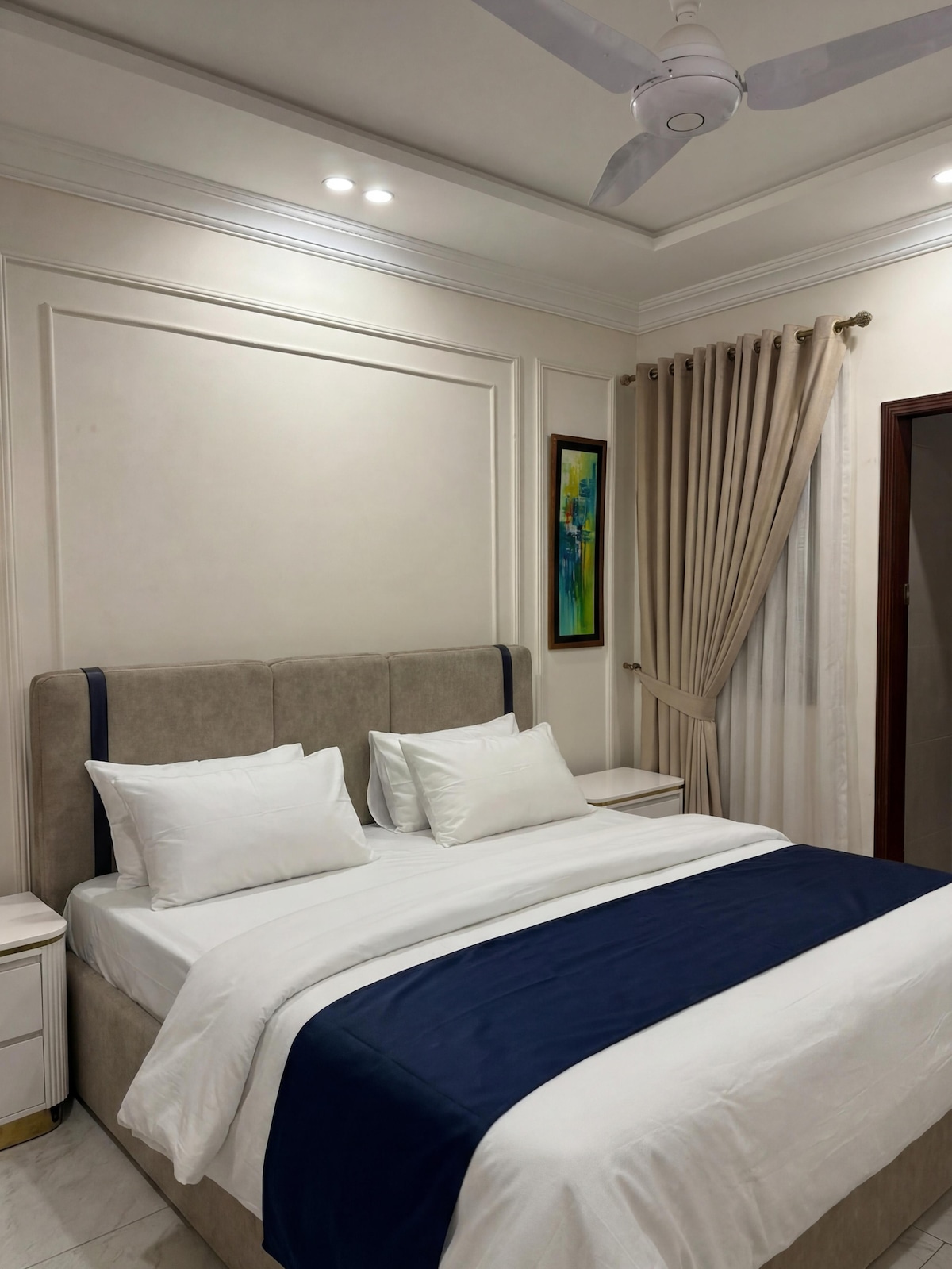 It is a modern cozy apartment suitable for couples and small families in a residential arena. It is located at the hub of Faisalabad city.