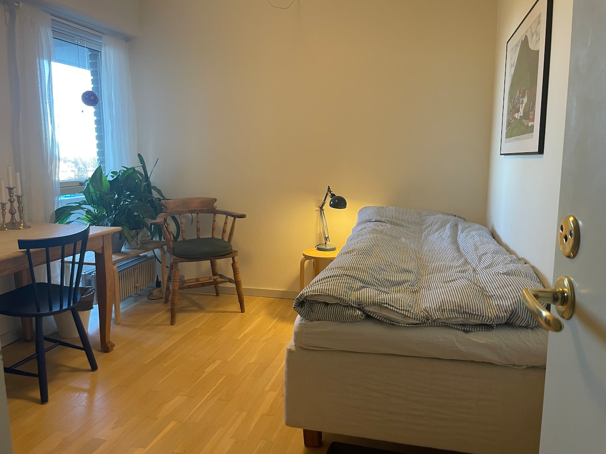 Aquí tienes una casa privada que se encuentra a poca distancia del transporte público, las compras y la hermosa naturaleza. Tienes tu propio apartamento con entrada privada, baño privado y cocina totalmente equipada. El apartamento está dividido en salón y dormitorio. En la sala de estar encontrará un sofá que se puede convertir en una cómoda cama para dos personas, así como una mesa con espacio para 4 personas. El dormitorio tiene dos camas individuales que se pueden convertir fácilmente en una cama doble. El apartamento está situado en un entorno tranquilo con aparcamiento inmediato asociado.