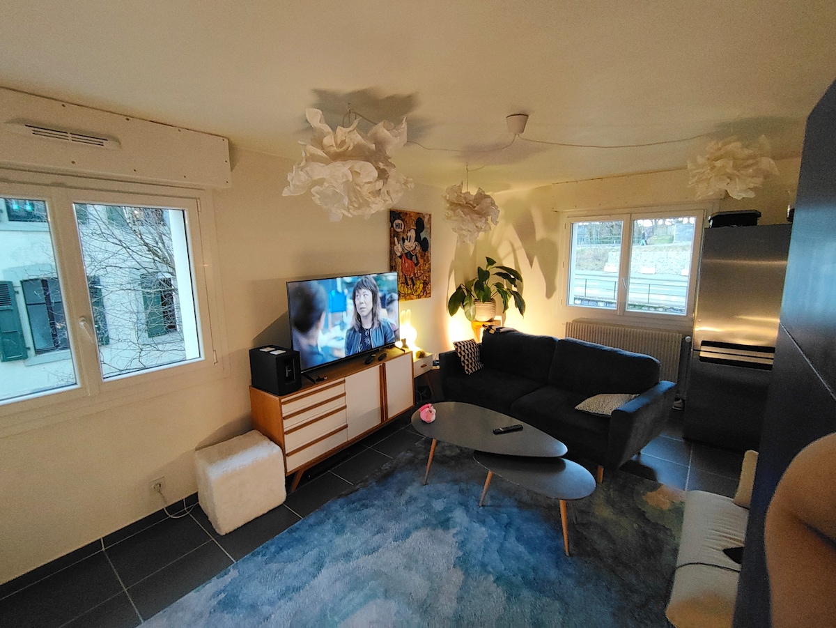 Estudio totalmente renovado que contiene lavadora, aparcamiento gratuito, cama doble, TV, internet de fibra, cocina equipada, baño/inodoro y armario doble. Idealmente situado para llegar a Ginebra, disfrute de un alojamiento tranquilo, elegante y céntrico. Cerca del transporte y las tiendas, este estudio para 1 o 2 personas con un hermoso exterior le encantará. está muy bien situado para llegar a Thonon/Evian o tomar el eje de la autopista para llegar al valle del Mont Blanc.