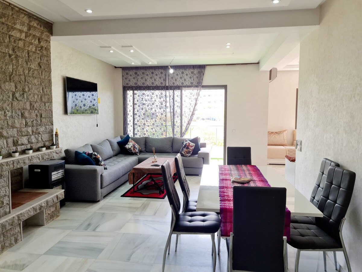 Magnífica villa afes -2 camas dobles -2 camas individuales -2 sofás - 3 habitaciones - 1 salón - Comedor -4 aire acondicionado (AC) -WiFi (Fibra) - Agua caliente -Televisión conectada a Netflix, todos los canales internacionales y deportivos, IPTV -Aparcamiento gratuito y seguro. Centro ideal para familias. -Barrio tranquilo y seguro. (¡Las parejas marroquíes deben estar casadas!) Lejos del transporte, mejor para los viajeros en coche. 15 minutos del aeropuerto_2 minutos de marjane_junto al bosque ainchkef -