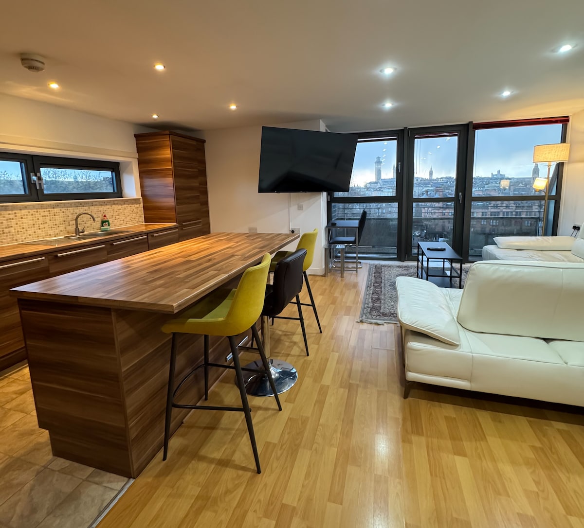 Welcome to The Skyline Suite — a stylish West End retreat offering sweeping skyline views from your own private balcony. Thoughtfully designed and comfortably furnished, this modern apartment is ideal for couples, small families, or friends seeking a well-located Glasgow base with a touch of luxury. The suite accommodates up to three guests and combines plush décor with practical amenities, making it equally suited to short city breaks, event stays, or longer visits.