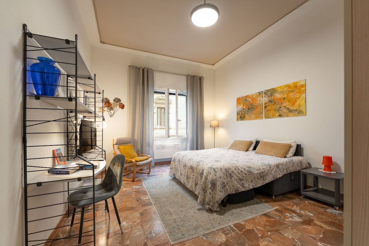 Bright and cozy, thoughtfully designed 2-bedroom apt with high-quality furniture and decor, part of a 1930s historical building with an elevator, featuring two double beds, WiFi, a fully equipped kitchen,bath, AC, TVs. Conveniently located just steps from Central Station and a short walk to the Duomo and San Lorenzo Market. Ideal for couples, families, or individuals wanting private rooms and central location. New double-glazed windows and electric shutters ensure acoustic and thermal insulation