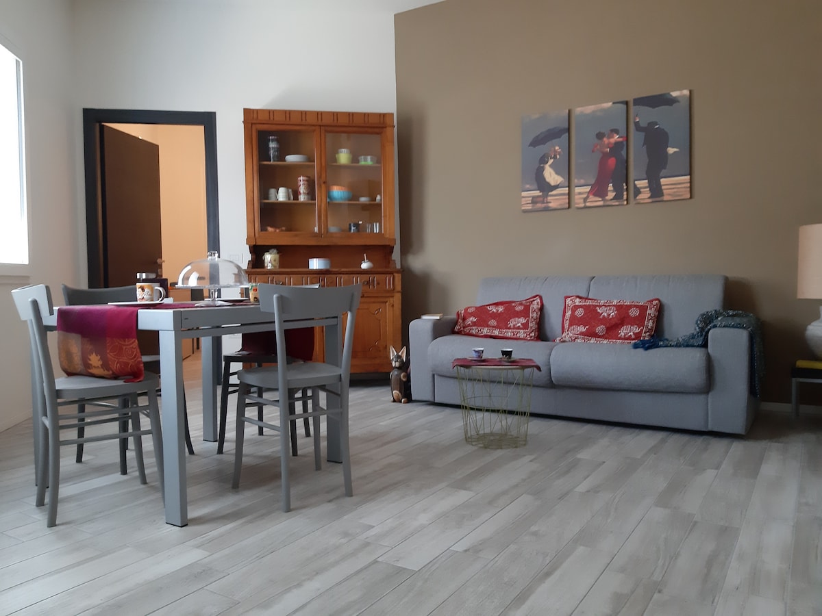 Casa de campo con tres apartamentos independientes, este apartamento consta de dormitorio doble, baño, sala de estar con sofá cama de una plaza y media (para dos niños o un adulto), pequeña cocina americana, terraza compartida y gran jardín. La ubicación es genial para aquellos que quieren visitar Romaña. La casa está a unos 30 minutos del mar (Lido di Classe, Cervia, Milano Marittima). Estamos a 15 minutos de Forlì y a pocas millas de otras atracciones turísticas. Contacta con tu anfitrión