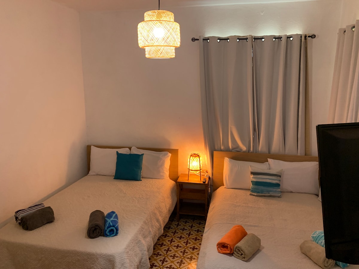 Our recently renovated Penthouse is setup with 2 queen size beds, has a full kitchen combined with living/dining, & a bathroom. The side doors open to a spacious patio. Its only a 7-10 minute walk to the Malecon (the main tourist strip) in Esperanza and is close to the Green Store so you can pick up supplies. We have the fastest wifi that we could get on the island, so guests can stay connected. Tropical gardens on first floor with a mango tree. Brand-new, upgraded Air Conditioner in this unit!