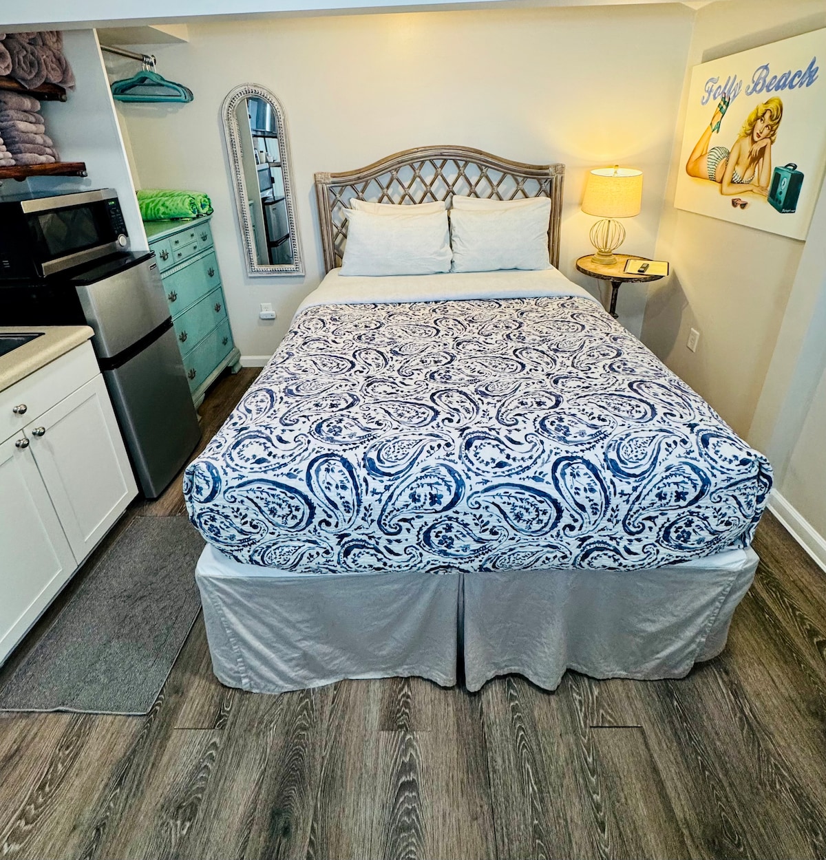 Welcome to your Folly paradise! This rustic 1940's beach bungalow was updated with modern appliances, brand new luxury bathroom, art, surfboards, 60" 4K smart TV ready for your subscriptions, stereo with bluetooth, and a huge outdoor shower. Guests love the privacy of having a secluded, full-sized property with great outdoor spaces, parking, and a short walk to the beach, bars and restaurants- for the same rate as a noisy condo. A retreat for guests that want a true old school folly vibe.