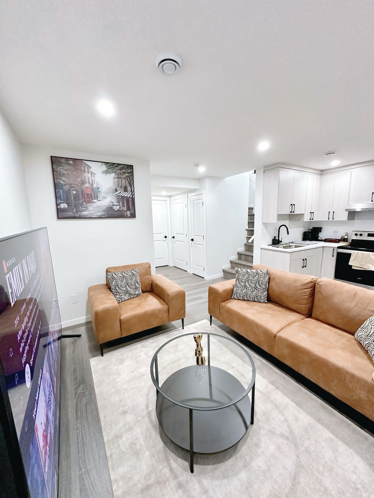 Acogedora y moderna suite con entrada privada | Escapada de nueva construcción Disfruta de una estancia elegante en esta suite sótano de un dormitorio en la vibrante comunidad de Walden de Calgary, conocida por sus parques, senderos para caminar, tiendas y restaurantes. Entrada ✔ privada y llegada autónoma Cama tamaño ✔ queen, TV inteligente de 55 pulgadas con Netflix, Amazon Prime y asientos acogedores ✔ Cocina totalmente equipada y baño moderno. A ✔ 5 minutos en auto de tiendas, restaurantes y farmacias. ✔ Fácil acceso al centro de la ciudad, Fish Creek Park y Banff Reserva ahora para disfrutar de una estancia relajante