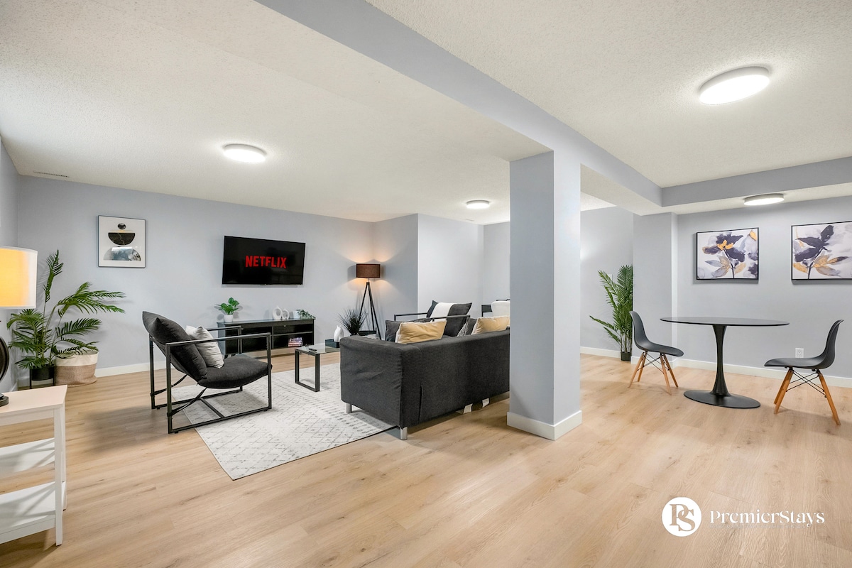 Moderno y cómodo, unidad de sótano privada con entrada lateral y aire acondicionado. Acceso exclusivo a 1 dormitorio con un nuevo colchón Endy tamaño queen, cocina americana totalmente equipada, sala de estar con TV inteligente, altavoz Alexa y estacionamiento. A poca distancia a pie de tiendas de comestibles, cine, licorerías, restaurantes, bares, el YMCA más grande del mundo y una biblioteca pública. Banff: 154 km (1 h 45 min) Centro de la ciudad: 30 km (25 minutos). Aeropuerto: 40 km (28 min) Canmore: 130 km (1 h 27 min)