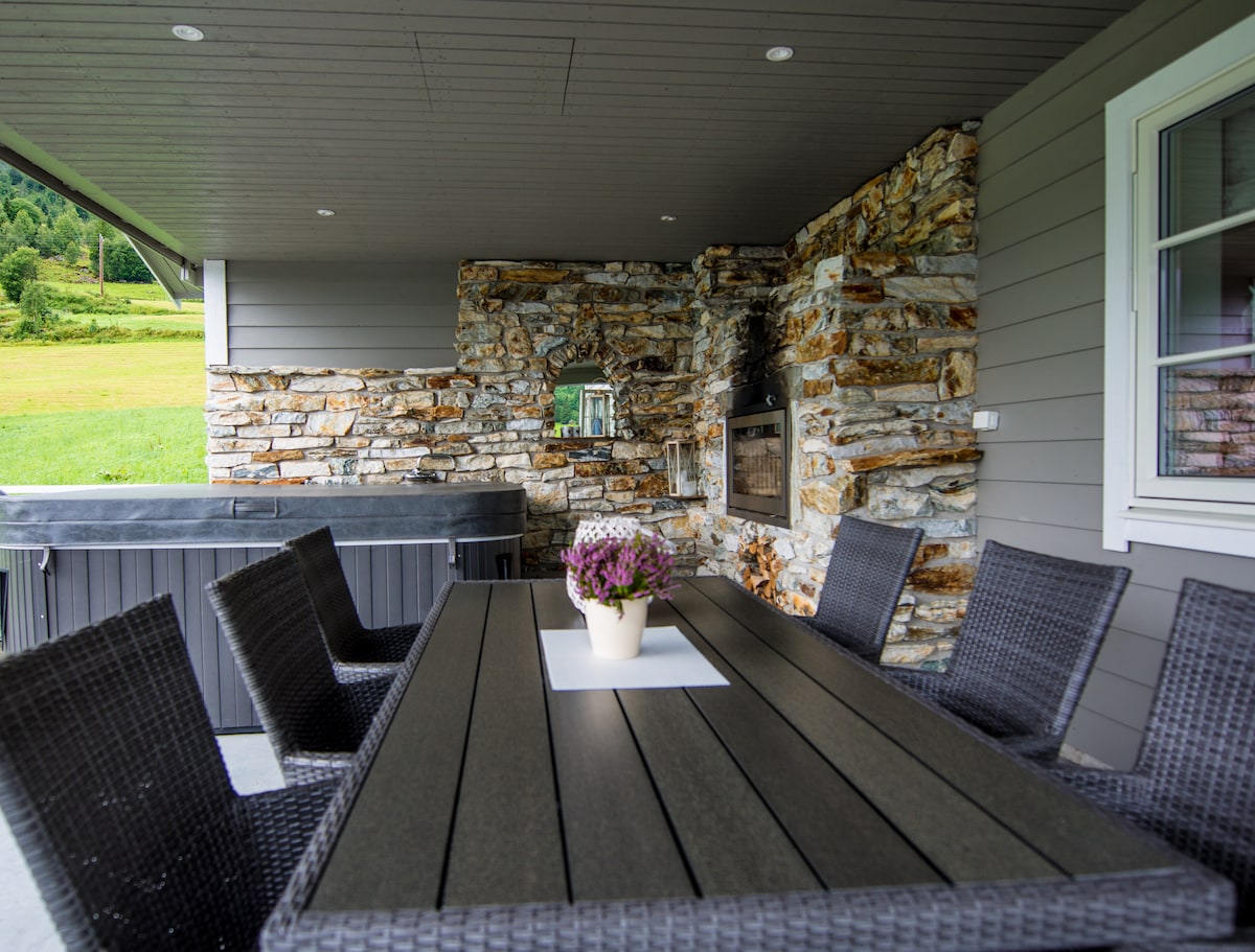 Esta hermosa casa se extiende por más de 250 metros cuadrados, incluida una terraza de 70 metros cuadrados, y le invita a relajarse en un entorno cómodo en el impresionante valle de Viksdalen. Hay maravillosos lugares de pesca en el río Gaular.Los caminos señalizados de Fossestien proporcionan muchos senderos de montaña diferentes. Por la noche, puede descansar en la terraza con su jacuzzi de 7 asientos, barbacoa de gas y muebles de jardín. La casa, con capacidad para nueve personas, ofrece camas grandes de alta calidad, tw whit netflix , mesa de billar, barco en el lago.
