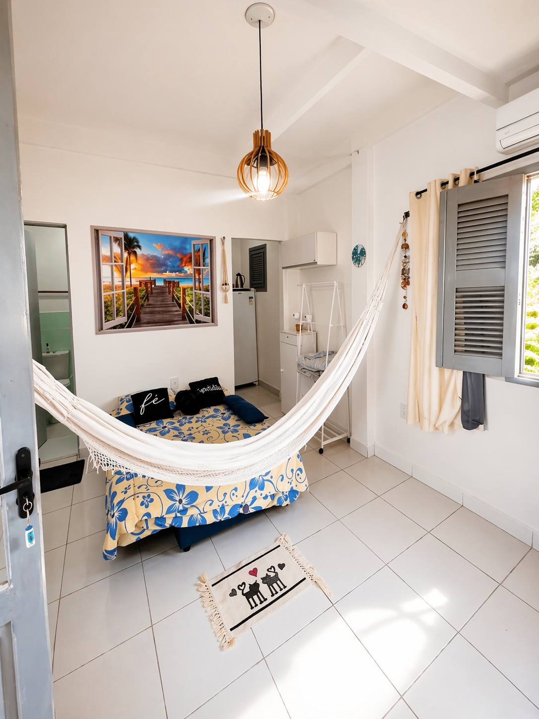 Apartamento privativo localizado no primeiro andar (acesso por escada), dentro da nossa casa, com total independência e conforto. Conta com banheiro completo, chuveiro, Smart TV e uma mini cozinha equipada com micro-ondas e frigobar. Para quem gosta de cozinhar, há um fogão disponível no deck externo. Ideal para quem busca praticidade, tranquilidade e um espaço aconchegante.
