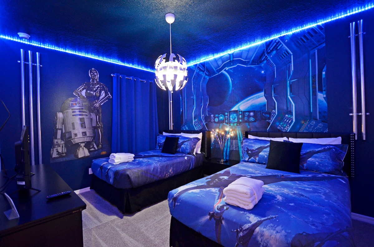 “¡A solo 3 millas de Disney hasta 16 huéspedes! Relájate en la piscina y el jacuzzi. Un cine de vanguardia privado, con una pantalla de 150 pulgadas, un proyector 4K y un sonido envolvente inmersivo. ¡Revive tus momentos favoritos de películas como nunca antes! Transmite en Roku, juega en PS5 y disfruta de wifi de alta velocidad para divertirte sin fin. La cocina bien equipada es perfecta para familias numerosas y con 6 dormitorios y 4 baños en suite, la privacidad está garantizada. Una Star Wars y una habitación temática de Disney para que los niños se sientan como en casa.