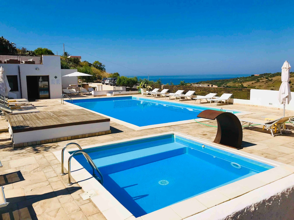 Villa Bifamiliare con ingresso e giardino indipendente, finemente arredato in tranquilla zona residenziale, sita a 5 km di distanza da Porto Empedocle, da soli 4 km dalla splendida Scala dei Turchi e da 11 km dalla Valle dei Templi. La terrazza offre la possibilità di usufruire della piscina, dell'idromassaggio e della zona solarium; l'apertura della piscina gratuita è dal 15 Maggio ad Ottobre con accesso 24/24. L'idromassaggio è sempre disponibile. L'autovettura per spostarsi è obbligatoria.