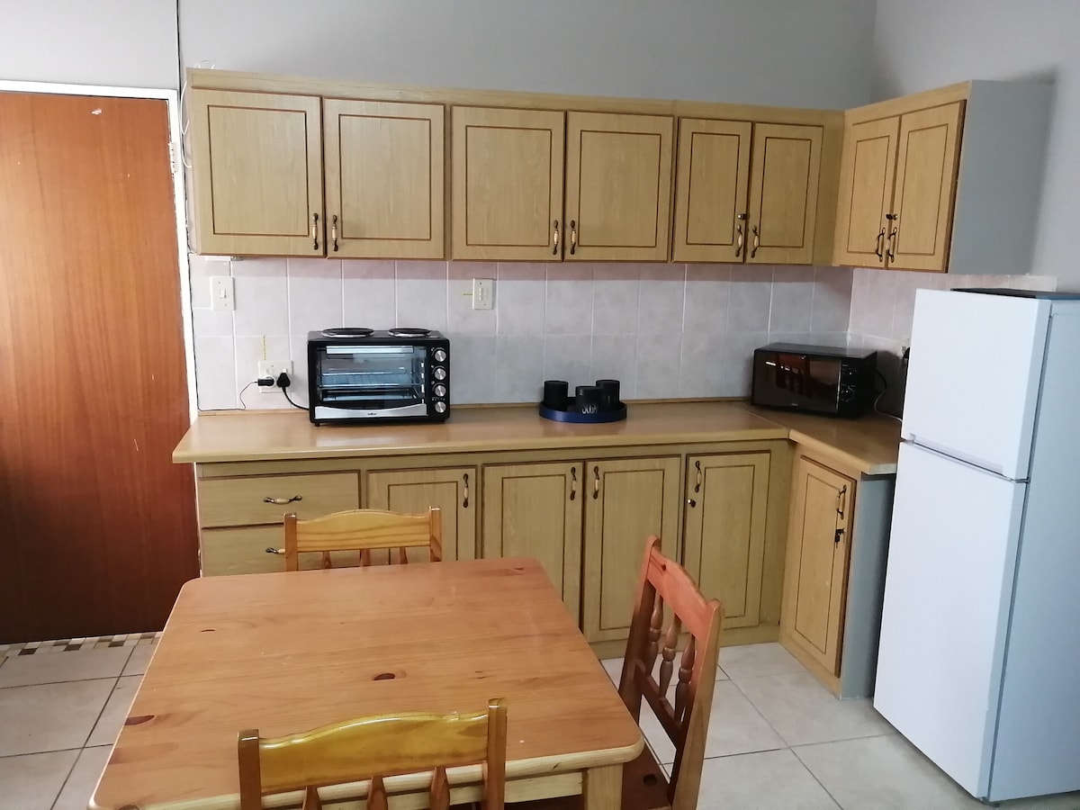 Mari ofrece un alojamiento independiente ordenado y seguro en la ciudad de Parys, al norte del estado libre. Esta es una zona segura y la unidad está situada junto a otras 7 unidades dentro de la finca. La unidad tiene capacidad para 4 huéspedes y comprende un dormitorio, baño, salón y área de cocina. El dormitorio está amueblado con una cama doble con una sola litera por encima. El baño está equipado con inodoro, lavabo y ducha y también contiene lavadora. La cocina de planta abierta tiene una mini isla.