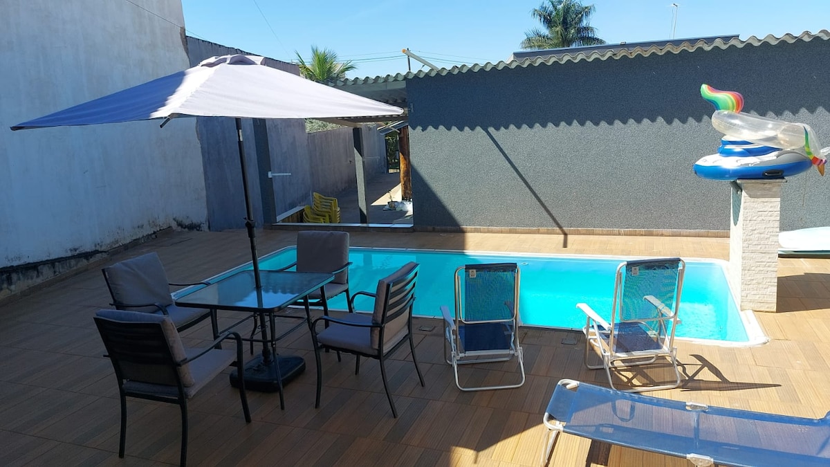Nossa casa campo e FAMÍLIAS filho, esposa(o), onde vai para descansar e compartilhar com seus amigos, aproveitar temporada para curtir piscina, conhecer a natureza dentro do condomínio, com pista de caminhada na área da reserva, curtir canto de vários passarinhos, pesca na barranca do rio, quintal casa campo muitas flores de várias qualidade, palmeiras Azul Imperial, coqueiro triângulo fenix, todo gramado pergolado com mesa e banco, estamos aguardamos a sua reserva em nossa casa de campo