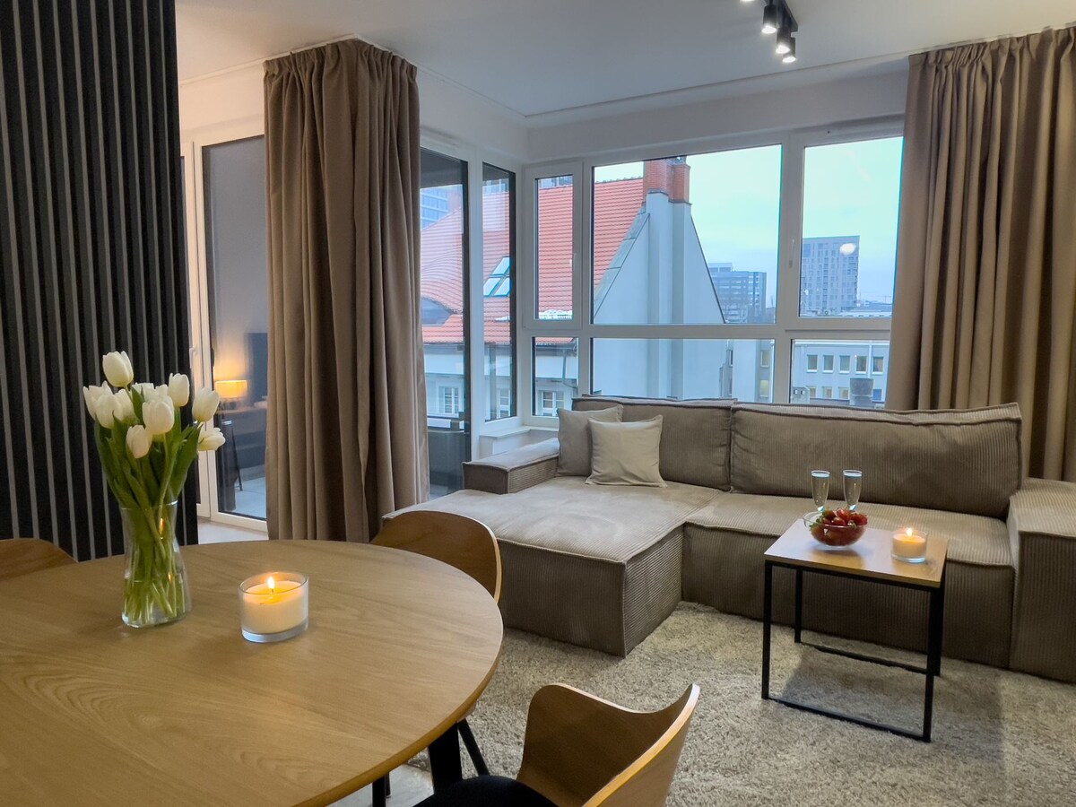 Soleado y cómodo apartamento en el primer distrito. ¡Impresionantes vistas desde el décimo piso! Más de 100 m2 de espacio (incluidos 20 m de terrazas): 2 dormitorios privados con cerradura para dormir y trabajar, más 2 lugares más para dormir en la sala de estar. Perfecto para solteros, parejas y viajeros de negocios con o sin familia. Excelente ubicación cerca de Spodek, NOSPR y el Centro de Congresos. El edificio cuenta con una tienda de comestibles, barbería, salón de masajes tailandés y Wine Taste by Kamecki.