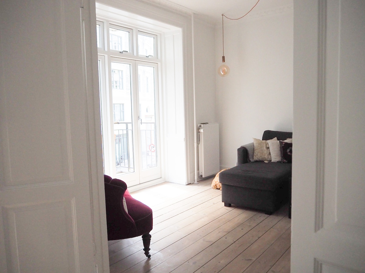 Bonito apartamento de 130 metros cuadrados de 2 plantas en el centro de Copenhague. SALA DE ESTAR Dos dormitorios y un baño con bañera y ducha en uno PRIMERA PLANTA Gran cocina con espacio para 6 personas. Dos salas de estar contiguas, donde hay espacio de escritorio en una - y sofá y televisión en la otra. Decoración moderna en una casa por lo demás muy antigua. Las plantas están conectadas por una escalera de caracol en el interior del apartamento. Desde la cocina y el baño se puede ver el patio trasero, los viejos tejados y la torre de la Iglesia de Nuestro Salvador.