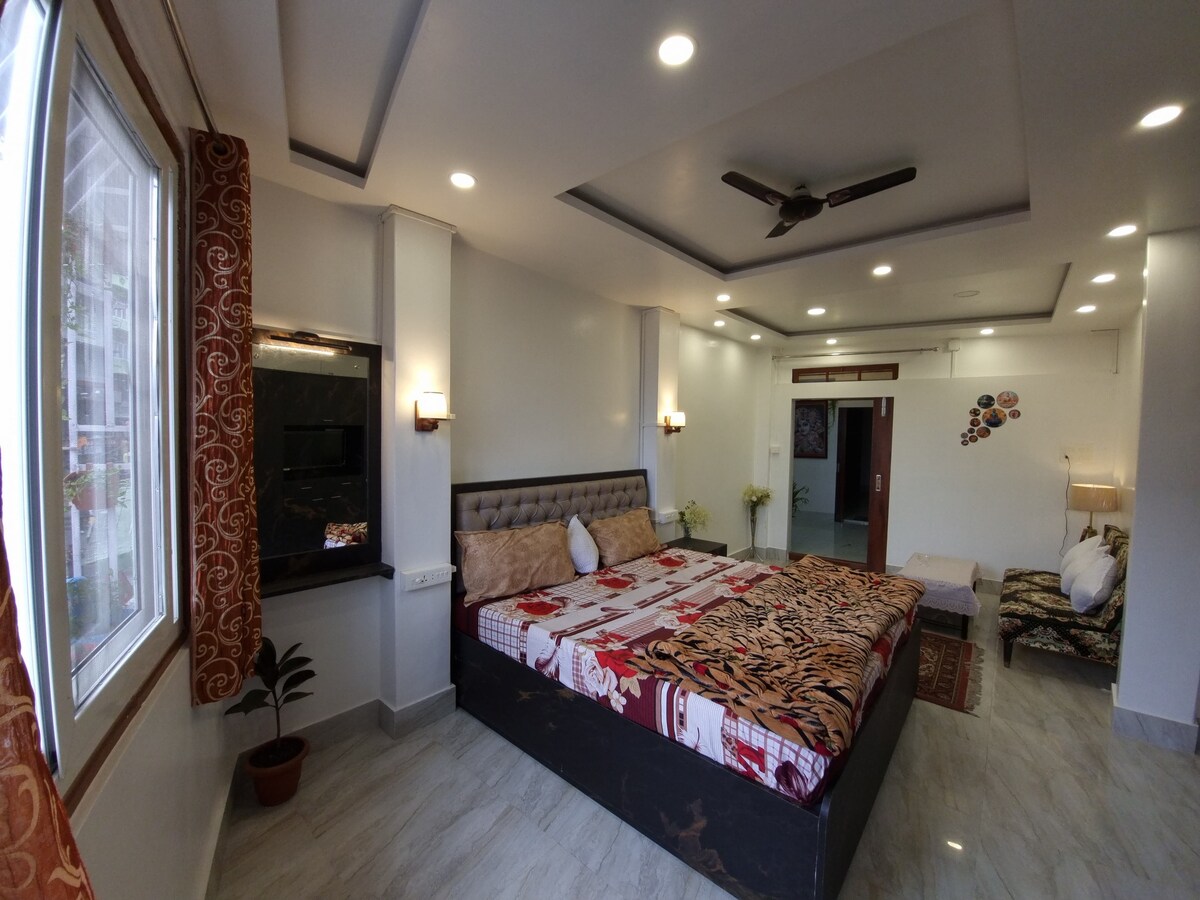 Piso de 3 bhk totalmente amueblado y de nueva construcción con interiores modernos y elegantes Hay tres habitaciones espaciosas con camas dobles de madera completa y colchones ortopédicos, y 2 baños espaciosos, uno adjunto con la habitación de la suite (habitación con una sala de estar dedicada). El apartamento tiene mucha luz diurna y está ubicado en el corazón de MG marg, Gangtok. Cocina totalmente funcional con nevera, microondas, lavadora automática y tres colchones y almohadas / edredones adicionales para alojar fácilmente hasta 9 huéspedes.