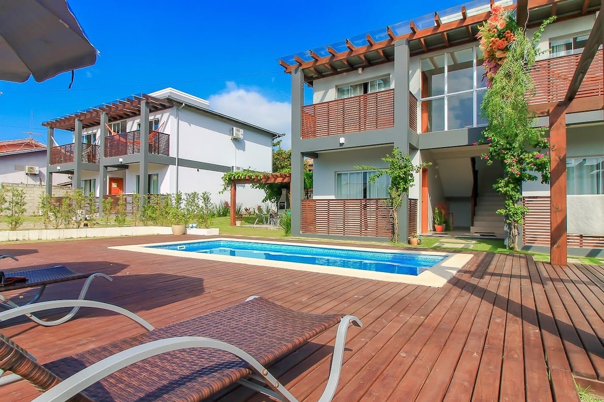 Loft con vista panorámica a Praia do Rosa, lugar Tranquilo y elegante, rodeado de bosque atlántico, a 5 minutos andando de la playa! Ducha de gas a presión, aire acondicionado frío-calor, cocina americana completa, balcón con hamaca, sillas de playa y sombrilla!!yo Internet 300mb, Smart TV 43 ¡Desayuno opcional! ATENCIÓN: No se permiten fiestas ni música alta, respete el periodo de silencio a partir de las 22h!