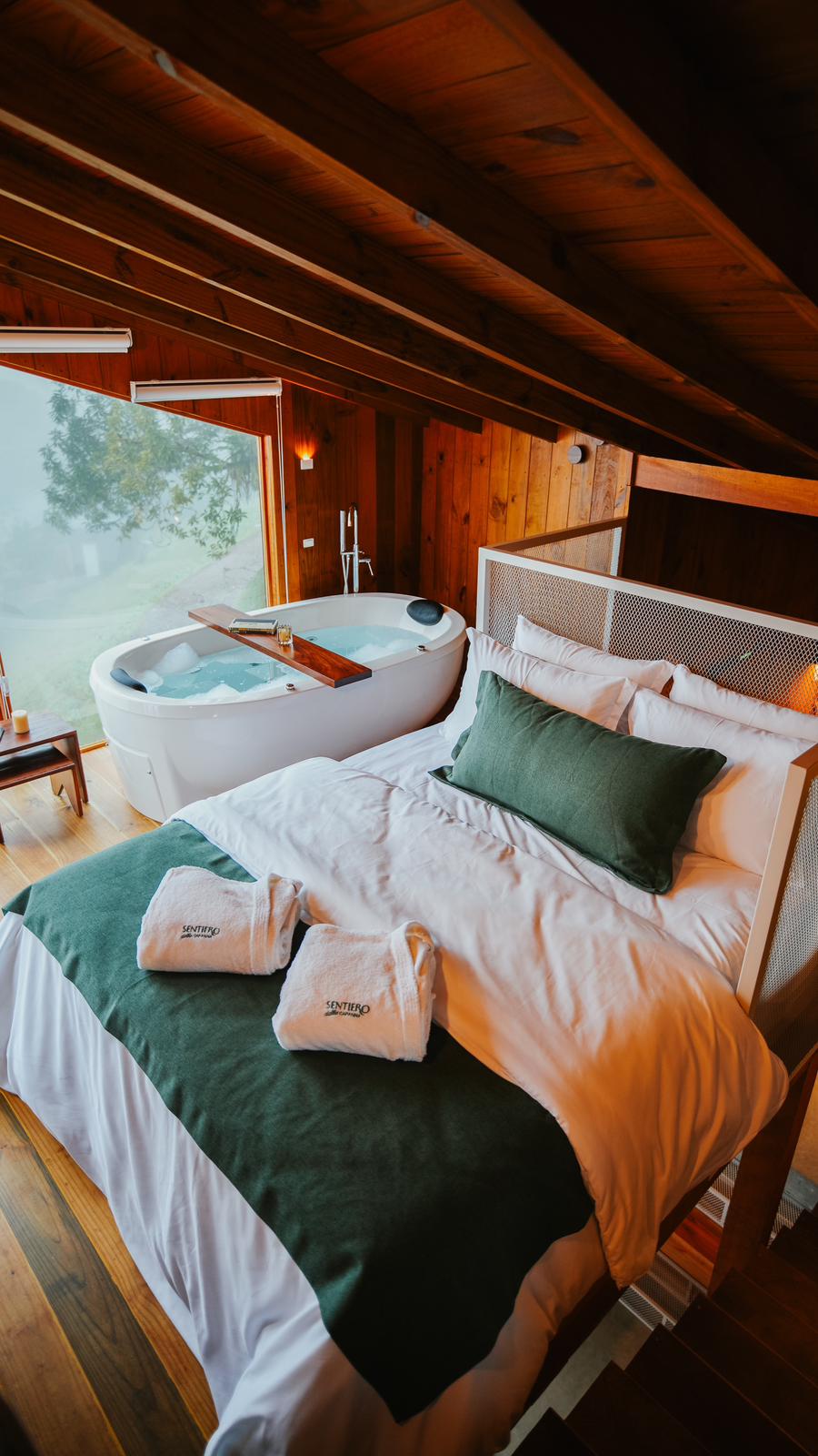 El Alpiníssima forma parte de Sentiero Cabanas. Ubicada en la parte más alta de la propiedad, nuestra encantadora cabaña es la escapada perfecta para parejas. Con una cocina acogedora, una chimenea para noches más cálidas y una terraza con vistas a las impresionantes montañas, este es el lugar ideal para reconectar con la naturaleza. Relájate en la bañera con agua o toma tu café en la cama mientras disfrutas y la inmensidad del verde. Disfruta de un alojamiento único, lleno de sentidos y diseñado para tu comodidad.
