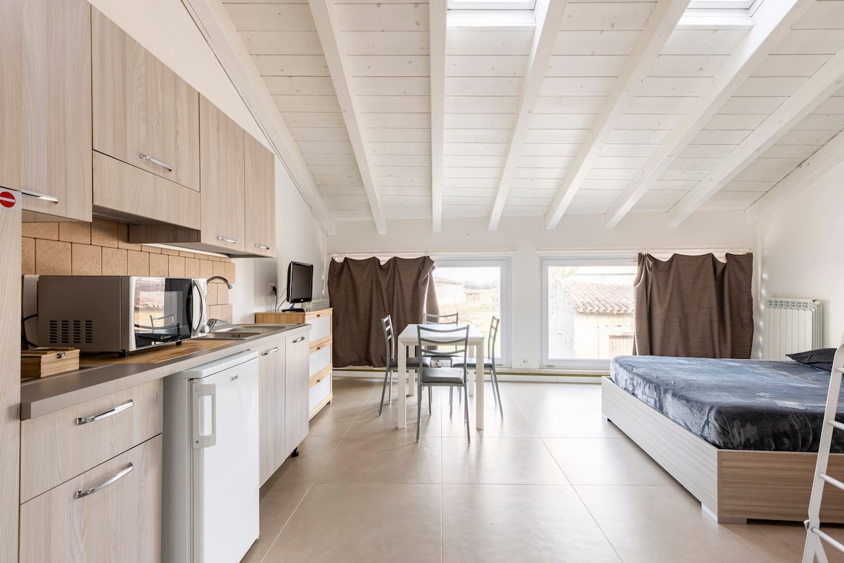 Mi casa ha sido recientemente renovada . Se encuentra en Valeggio sul Mincio en un lugar tranquilo y verde. Es un estudio para 4 personas, independiente y con estacionamiento privado. Incluye un baño con ventana, ducha, inodoro, bidé. Hay una cocina equipada con cafetera espresso, estufa de inducción, microondas, nevera y pequeño congelador. Desde la terraza, equipada con una mesa y sillas, puedes disfrutar de hermosas puestas de sol en las colinas cerca del lago de Garda.