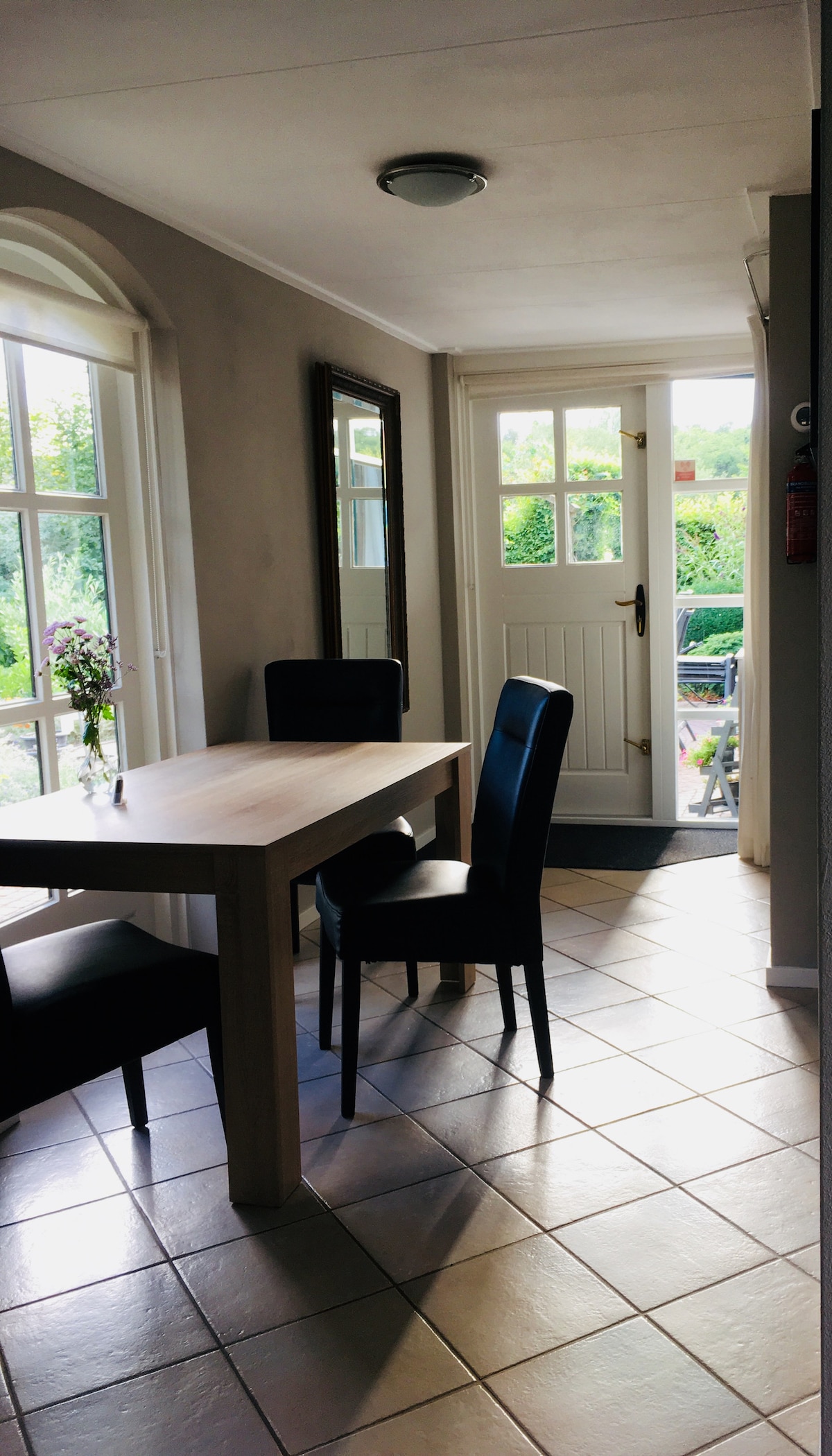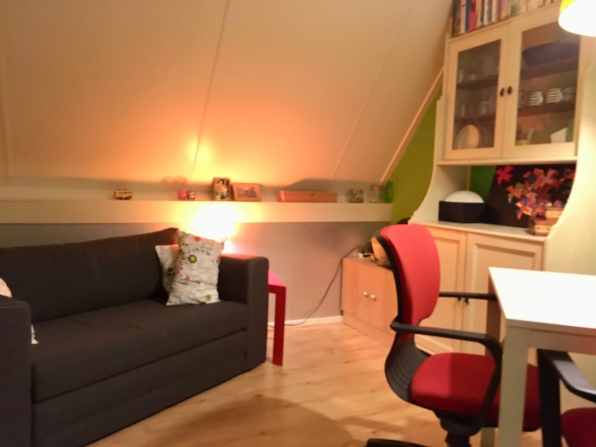 Bienvenido a Bosch en Duin, a nuestro antiguo garaje/cobertizo, que se convirtió en una casa muy lujosa y elegante el 1 de septiembre de 2016. Ideal para 2 personas, pero también adecuado para una familia con 2 niños o 4 amigos. La casa está completamente aislada y se calienta con calefacción por suelo radiante y una estufa de leña. Gracias a una ventana tan grande como las puertas del garaje y, en el otro lado, ventanas hasta la cumbrera y 3 grandes claraboyas, es un espacio maravillosamente luminoso con hermosas vistas al jardín y al bosque de un total de 2800 m. El garaje consta de un gran espacio con una unidad de madera en el centro. En un lado de la unidad hay una hermosa cocina completa con 4 fuegos/horno combinado, lavavajillas y refrigerador integrado en una encimera de piedra dura. En el otro lado hay una pequeña pero elegante ducha (con grifo termostático), un inodoro y un lavabo con grifo automático y espejo iluminado anticondensación. La unidad ofrece amplios armarios y cajones y una escalera hacia arriba. En la unidad hay una cama doble de 1,60 x 2,00 m con un maravilloso edredón de lana de oveja de 2,00 x 2,00 m. Para los huéspedes con miedo a las alturas, hay un amplio y cómodo sofá en la sala de estar que se convierte en una cama doble de 1,40 x 2,00 m con un solo movimiento. Además de este amplio sofá de esquina, hay una silla de tela para deslizarla cerca de la estufa. En el comedor hay una amplia mesa de madera con 4 sillas. Los dibujos y las esculturas de cerámica de nuestro hijo, el artista Hannes, le dan al espacio un aspecto muy personal y alegre. La casa tiene su propia terraza privada y maravillosamente protegida con cómodas sillas de jardín con cojines. En el bosque hay un banco para disfrutar de la naturaleza en paz o leer un libro. Por último, hay una hamaca para una maravillosa siesta. La casa tiene wifi, con el que se puede ver la televisión en el iPad disponible a través de nuestra conexión Ziggo, así como radio. Así que no hay televisión de pantalla plana. Nosotros tenemos un perro, pero no queremos perros en De Garage. Los huéspedes pueden utilizar toda la casa, así como la terraza, el bosque y la entrada para aparcar su coche. Estaremos presentes cuando los huéspedes lleguen y se vayan. Además, les contamos a los huéspedes sobre nuestra casa, el equipo y los alrededores. No se puede fumar en la casa. No ofrecemos desayuno ni otras comidas. Combine naturaleza y cultura en «De Garage», en la finca Ter Wege en Bosch en Duin, rodeada por los bosques de la cordillera de Utrecht y a poca distancia de Utrecht y Amersfoort, con sus numerosos museos, restaurantes y otras opciones de entretenimiento. Los huéspedes pueden utilizar nuestras bicicletas. Hay una parada de autobús a unos 10 minutos a pie. Por supuesto, el transporte propio siempre es más fácil y rápido. Los huéspedes siempre pueden contactarnos por teléfono para cualquier pregunta.