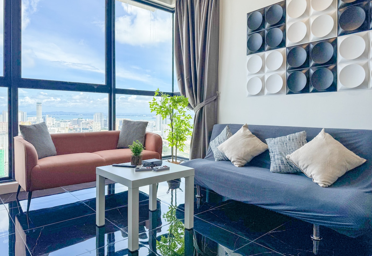 Suites marítimas con cómodas ★ Vista panorámica al mar ★ Vistas al amanecer Vista al puente de★ Penang Planta ★ alta. Equipo de alojamiento cómodo para Superanfitriones de★ 5 estrellas Dúplex con vista al mar★ más cercano a la zona central del patrimonio de la UNESCO • 1200 pies cuadrados • 1 estacionamiento privado • Wifi de 300 Mbps • 30 restaurantes, cafeterías, pubs, Starbucks, Coffee Bean, FamilyMart, 7-Eleven están debajo de nuestra casa. • Totalmente climatizado • Los paquetes turísticos están disponibles • De 5 a 10 minutos en coche de Chew Jetty y del casco antiguo declarado Patrimonio de la Humanidad por la UNESCO.