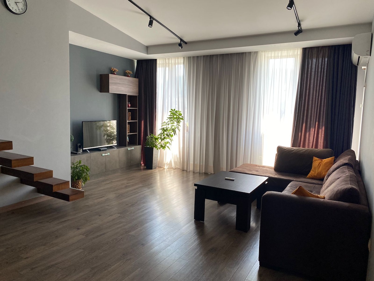 El ático está situado en el centro del casco antiguo, en el distrito de Abanotubani. El ático es un apartamento de dos niveles con 3 dormitorios y 2,5 baños que incluyen baños de tres piezas más jacuzzi o ducha. También se proporcionan lavadora, plancha y tabla de planchar. El apartamento cuenta con impresionantes vistas a los principales sitios históricos de Tiflis, como la fortaleza de Narikala y los jardines botánicos. Las principales zonas de entretenimiento también están cerca, como restaurantes, cafeterías y varios supermercados.
