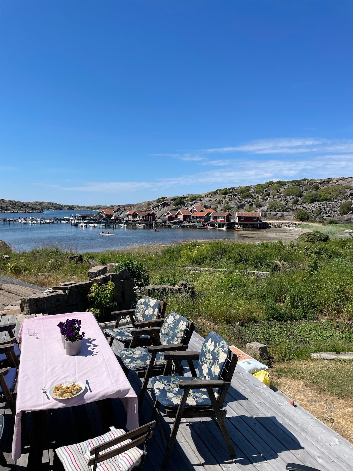 Aquí vives en tu propia casa con impresionantes vistas en Bovallstrand, Sotenäs en la impresionante Bohuslän. La casa cuenta con cocina, inodoro y ducha, lavandería con secadora, TV con cromecast. Máx. 4 personas. La casa tiene una terraza y un bonito patio con vistas al mar, bar de cobre y corte. La limpieza no está incluida, pero si no desea limpiar usted mismo, puede ordenar la limpieza por un recargo de 900 SEK. No se admiten mascotas.