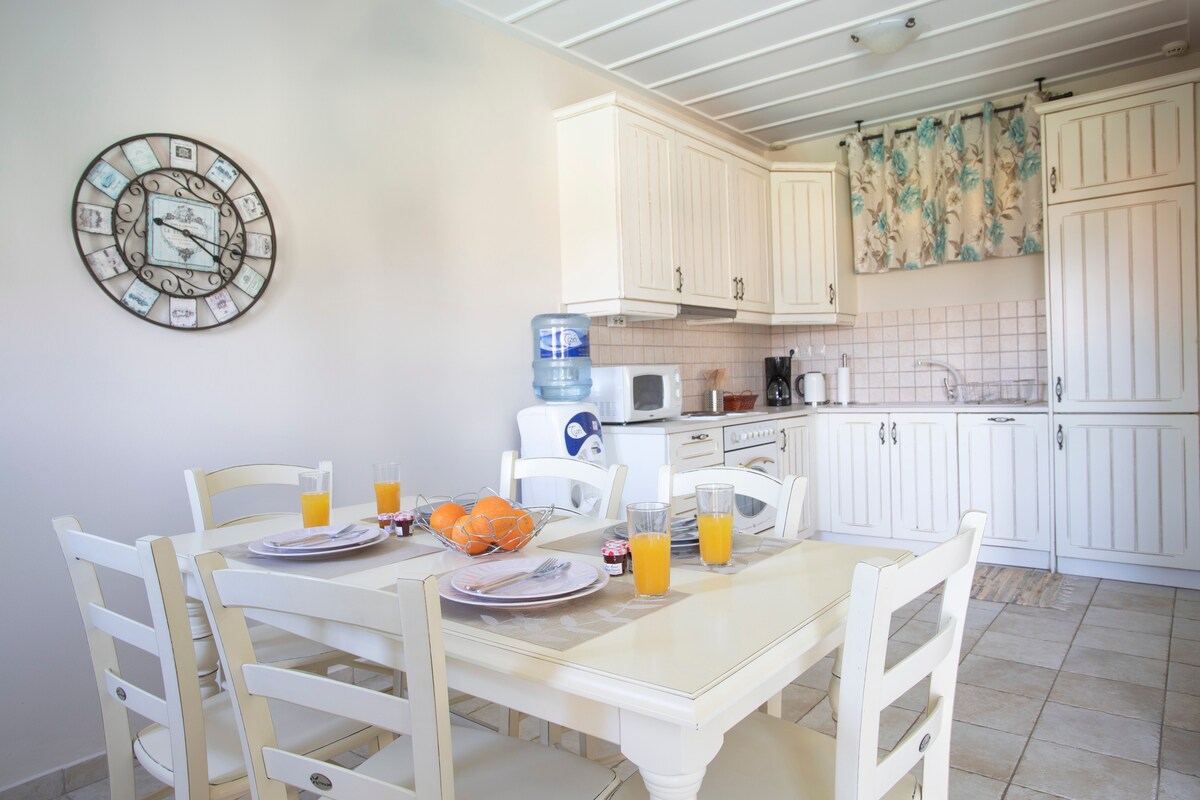 Relájate en una terraza en la ladera de una colina con vistas al mar mientras la refrescante brisa marina fluye durante todo el día. Por la noche, el aire lleva el aroma del jazmín y la madreselva. El ambiente sereno continúa en el interior con plantas en macetas, elegantes muebles empotrados y una decoración de buen gusto en tonos tierra apagados. La iluminación y otros detalles completan la serenidad. La casa tiene un ambiente relajado y espacioso, que combina arquitectura moderna con elementos tradicionales. Podrás disfrutar de materiales de alta calidad, techos altos, luz divertida y lino fino. Hay un altavoz bluetooth disponible para disfrutar de tu música favorita desde tu ordenador. Los dormitorios tienen baño privado. Se proporciona una cocina totalmente equipada con lavavajillas y cafetera espresso. Hay una barbacoa de piedra disponible. Para los meses más fríos, hay una estufa de pellets junto con mantas eléctricas que dan una sensación cálida. Tienes acceso a nuestro propio huerto, según la temporada, por supuesto. Estoy disponible en todo momento para cualquier ayuda que necesites. Aunque la isla de Ithaki es pequeña, tiene muchos tesoros escondidos. Será un placer ayudarte a explorarlos. Cualquier servicio relacionado con las vacaciones, como alquileres o reservas, se puede reservar bajo petición. La isla de Ithaki es un lugar bastante íntimo con muchos tesoros por descubrir. La casa se encuentra en el pueblo de Ag. Saranta, un asentamiento tradicional en la parte norte, con vistas a la bahía de Afales. La playa cercana con aguas increíbles está a 5 minutos en coche. El pueblo de Stavros, con todos los servicios, y el pueblo pesquero de Frikes están a 1,5 kilómetros. Por desgracia, no hay transporte público en Ítaca. Es muy recomendable alquilar un coche. El acceso a Ithaki es a través de Cefalonia, Patras, Astakos y en los meses de verano desde Lefkas también.