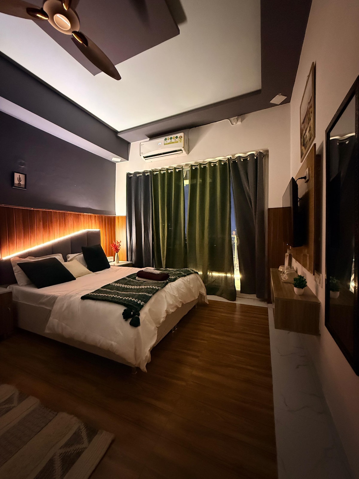 Welcome to our serene green-themed 3BHK — a perfect blend of comfort and modern living. Enjoy seamless entertainment on a Smart TV, high-speed Wi-Fi, and reliable power backup for a worry-free stay. The fully equipped kitchen with RO water, complete cooking and serving essentials, and a spacious dining area makes it ideal for families and long stays. Step out onto the open balcony to relax and unwind in fresh air. Designed for comfort, convenience, and a peaceful home-away-from-home experience.