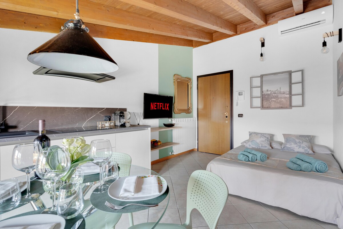 Elegante apartamento a 1,5 km del aeropuerto Orio al Serio BGY, muy cerca del centro de Bérgamo, Orio Center y la Feria de Bérgamo. El apartamento tiene un dormitorio con cama doble, sala de estar con sofá cama doble, cocina equipada, estufa de inducción, microondas, hervidor de agua, cafetera, TV, wifi, aire acondicionado en el dormitorio y la sala de estar, baño con ducha, secador de pelo y lavadora. Llegada autónoma y desayuno ofrecidos por nosotros. El estacionamiento está disponible bajo solicitud.