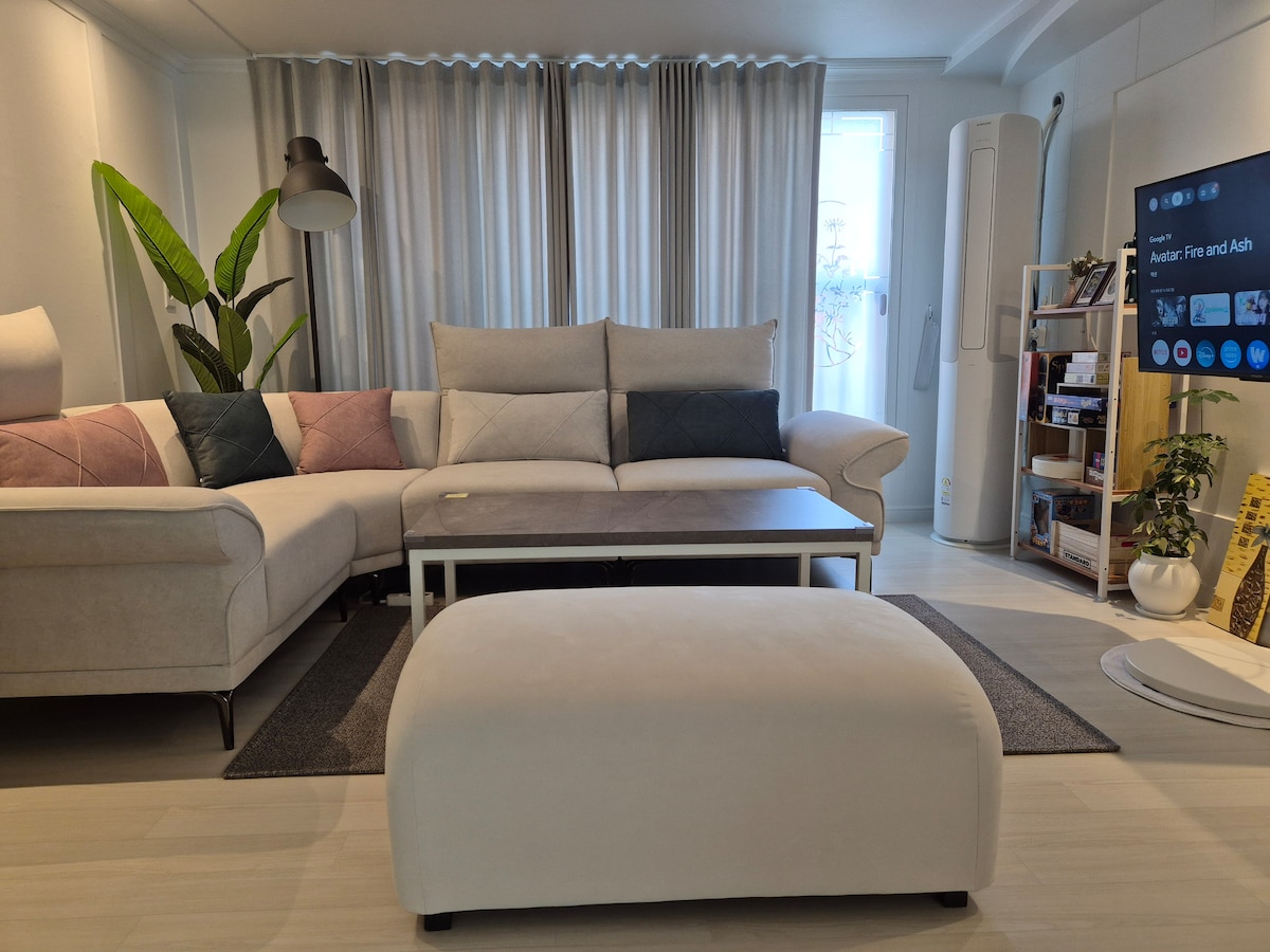 "숙소 예약할 때 화장실 한 개라 불편하셨죠? 저희 숙소는 28평의 쾌적한 크기에 화장실이 2개라 아침 준비 시간도 여유롭습니다. 최고급 킹사이즈 침대 2개와 더블싱글 1개를 갖춰 온 가족이나 친구들이 모두 편안하게 숙면할 수 있습니다. 넓은 거실과 풀옵션 주방에서 소중한 사람들과 특별한 추억을 만들어보세요!"