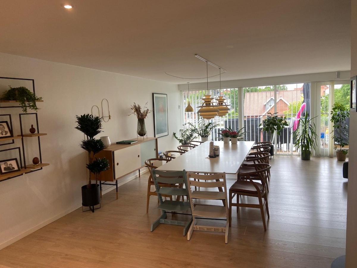 Residencia de 310 m2 66 m2 azotea Terraza de 60 m2 en el jardín Jardines naturales encantadores de 1900 m2 con columpios, cama elástica, casa de juegos y caja de arena 4 habitaciones 1 oficina 2 baños, 1 inodoro Bañera Sauna Ude Spa S refrescos exteriores (agua caliente) Sala de estar y chimenea con estufa de leña Bodega de vinos de varias habitaciones y gimnasio Toda la casa está con calefacción por suelo radiante. La ley de la casa Max visita diariamente, especialmente si pones nueces y semillas para ello. El centro de la ciudad de Aalborg, las colinas de Rebild o la tienda Økssø a 15 minutos en auto, o camina hasta el tren en 10 minutos.