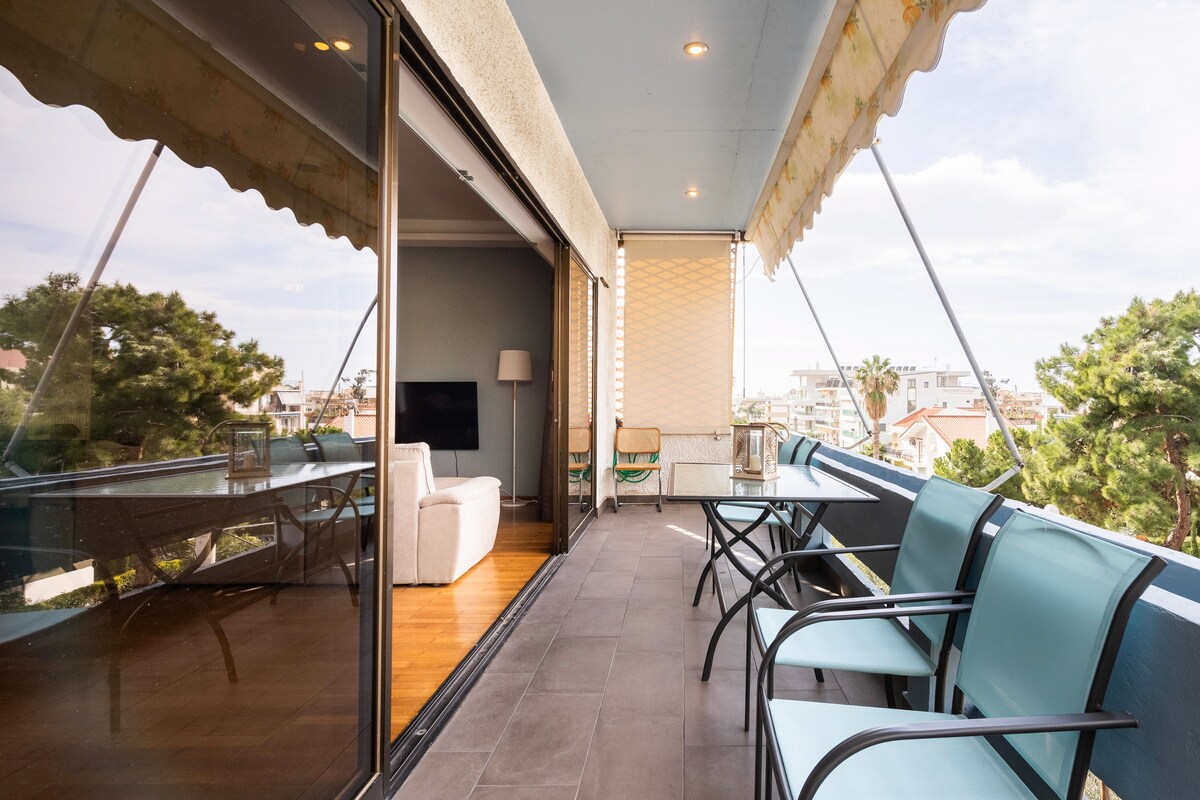 Amazing sea views ! Fulky refurbished, quiet (double glazing), functional apartment, 2 balconies, 1 full bathroom with large shower, 1 WC, 2 bedrooms & fully equipped kitchen (oven, large fridge, filter coffee machine, nespresso ,crockery, cutlery, glassware, pots, pans etc. On the top (5th) floor of an apartment building in the heart of Glyfada city. Easy access on foot to the beach / ocean, shops on Metaxa Avenue, and the bus & taxi depots and to numerous restaurants, shops and cafes.