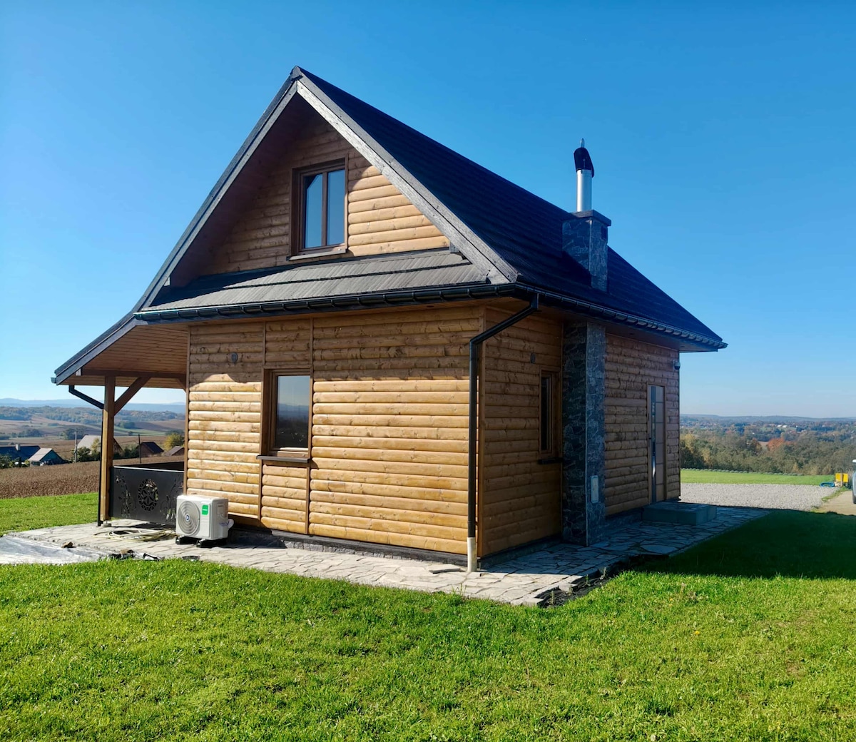 Klimatyczny domek z drewnianych bali położony na wzgórzu z pięknym widokiem z okien i tarasu na pobliskie wzgórza. Powierzchnia domku 76m2. W pełni wyposażona kuchnia. Salon z kominkiem i dużym stołem oraz rozkładanym narożnikiem. Z salonu wyjście na duży taras. Dwie przestronne sypialnie. Łazienka z prysznicem. Przy domu znajduje się prywatny parking.