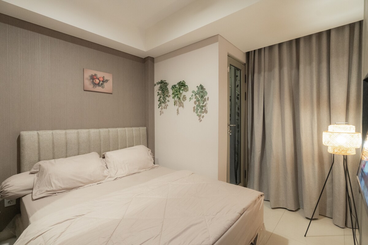 Refúgiate en un oasis de tranquilidad donde las líneas limpias, los materiales naturales y una armoniosa paleta de colores crean una sensación de serenidad. Este alojamiento en Airbnb cuidadosamente diseñado es un remanso de simplicidad y funcionalidad, que ofrece una escapada tranquila del bullicio urbano. Con acceso directo al centro comercial Central Park, estás a solo unos pasos de un mundo de compras, restaurantes y entretenimiento. Tanto si te apetece ir de compras como dar un paseo por el acuario de Yakarta, todo está a la vuelta de la esquina.