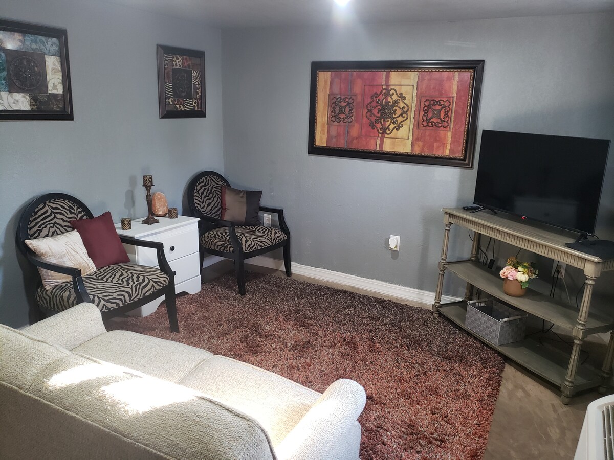 Este acogedor dúplex de temática boho se encuentra en Cartago, Misuri. Es un estudio totalmente amueblado que incluye 1 cama tamaño queen y un nuevo colchón futón completo con muelles interiores. Cuenta con un baño recién renovado, una cocina espaciosa, una zona de trabajo e internet de alta velocidad. Un televisor inteligente Vizio de 55 pulgadas con acceso a Netflix, Hulu, etc. ubicado en la sala de estar. Hay mucho aparcamiento en las instalaciones, junto con un código fácil de 4 dígitos para el registro. *SE ADMITEN ESTANCIAS LARGAS* Si tienes alguna pregunta, envíame un mensaje al 417-438-2200.