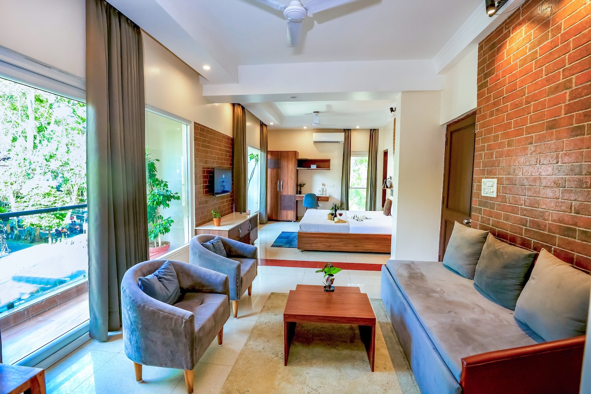 ♂Acomodate en la comodidad de un monoambiente elegantemente diseñado, incluso más grande que cualquier habitación de hotel, con la ventaja de tener su propia cocina, en el corazón de Gomtinagar. Este moderno departamento tipo estudio en el segundo piso es ideal para 4 personas. Sus grandes ventanales y balcones de vidrio se abren a la vegetación y al bullicio que rodea la propiedad. Los centros comerciales, supermercados, restaurantes, tiendas, lavanderías, etc. están a poca distancia a pie de este lugar, para tu comodidad.