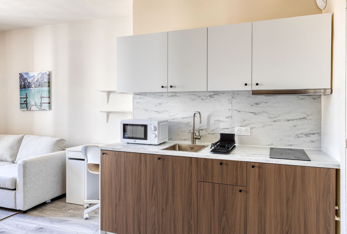 Estudio de 20 m2 totalmente renovado, totalmente equipado. El estudio: - La sala de estar: sofá cama (140 cm x 200 cm), TV LED inteligente, techo equipado con una cortina de cabeza LED y un altavoz Bluetooth incorporado. - Cocina pequeña: horno, placa doble, microondas, nevera, cafetera Senseo. Servicio completo de platos y utensilios de cocina (sartenes, ollas...). El baño: ducha italiana, vestidor y secadora de toallas. Se proporciona sábana, manta, almohadas, toalla de baño.