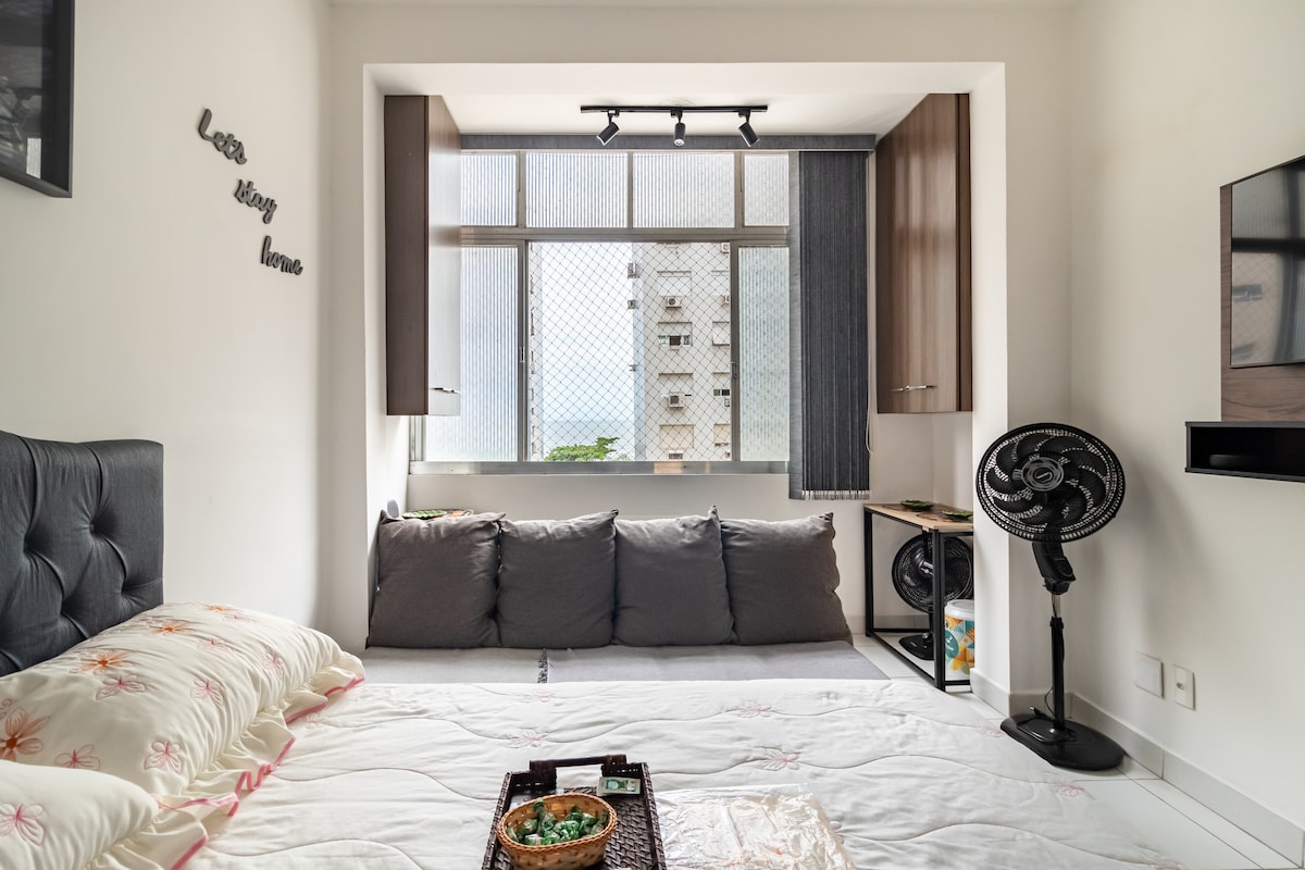 Abrace o descanso em um kitnet tranquilo e bem localizado. A 50 metros da Praia, próx ao Shopping, com os melhores bares, restaurantes e comércio da região! Excelente para Home Office , completo e compacto com : ✅fogão, geladeira, ventilador de teto e portátil , filtro, air fryer, microondas, forno, chuveiro, sanduicheira, cafeteira. ✅cama de casal , sofá-cama. ✅copos,talheres, toalhas, lençóis, travesseiros. ✅TV smart e wifi rápido, ideal também p/ Home Office. ✅Plataforma Streaming.