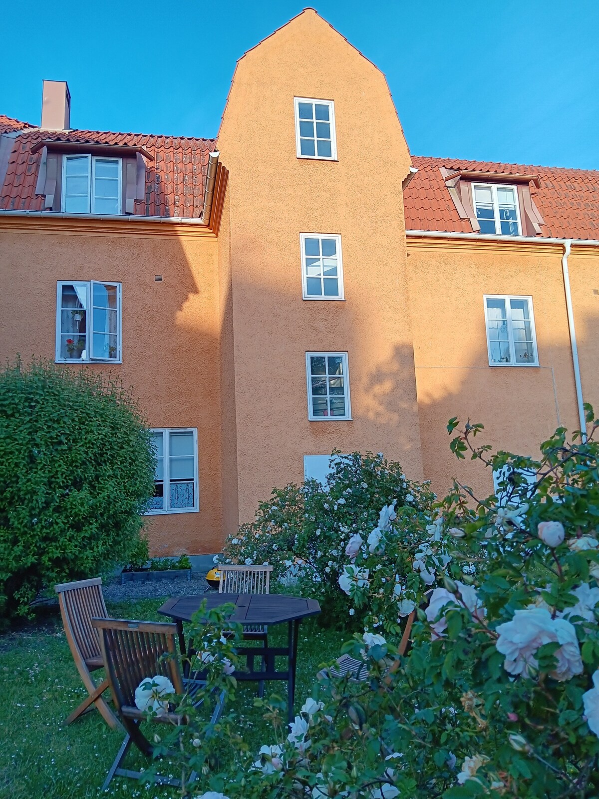Piso de principios de siglo de la década de 1890 con vistas inigualables de los tejados de Visby, el puerto y el mar. Apartamento con ventanas en todas las direcciones, estufa de azulejos, techos altos y una hermosa entrada de luz desde todas las habitaciones con grandes secciones de ventanas. 4 dormitorios con capacidad para 6 personas, lugares de trabajo/escritorio en cada habitación. Otro lugar de trabajo en el "estudio" donde también hay un piano disponible. Wifi y canales de streaming para TV y música. Baño con bañera y ducha, y un aseo adicional. Maravilloso jardín.
