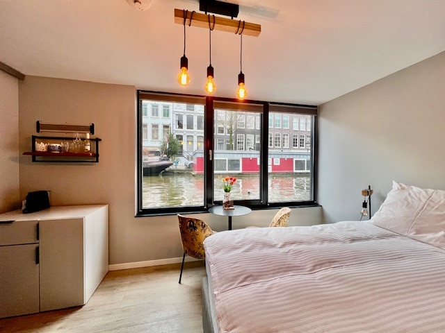 Un hogar lejos de casa. ¿Buscas un lugar moderno, luminoso y acogedor en Ámsterdam? Este es tu lugar. No muy lejos del NDSM y a pocos pasos del ferry que te da acceso al centro de Ámsterdam, este lugar tiene todo lo que necesitas. Tienes tu propia entrada, habitación privada con baño y aseo y una terraza sobre el agua.