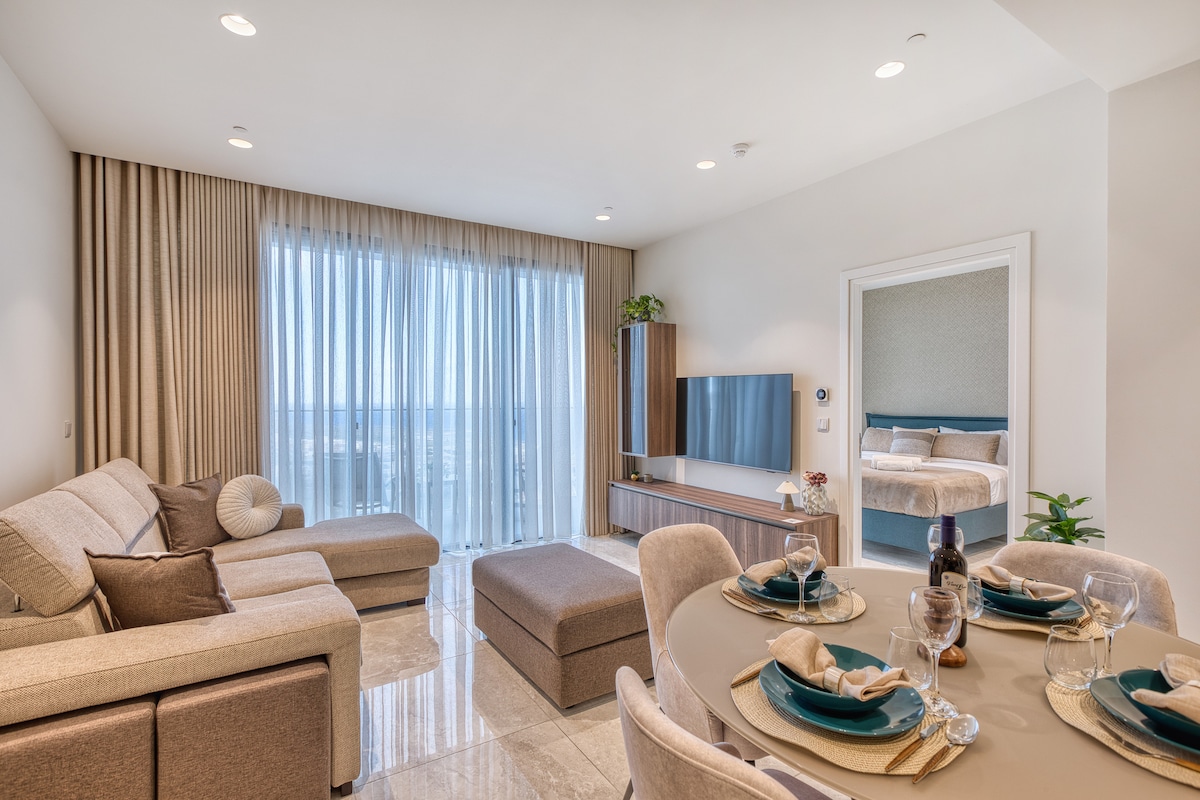 Brand-new designer apartment, 25th floor Mercury Towers by Zaha Hadid. Wake up to breathtaking sea and city views from every corner; including bath, sofa, dining table, or balcony. Relax in a stylish, modern kitchen with fine wine glasses and coffee machine, black marble walls, smart TV with Netflix, and outdoor lounge seating. Enjoy free access to rooftop and tower pools, gym, and spa; simply perfect for work, long stays, or a luxurious getaway. I’d love to host you!