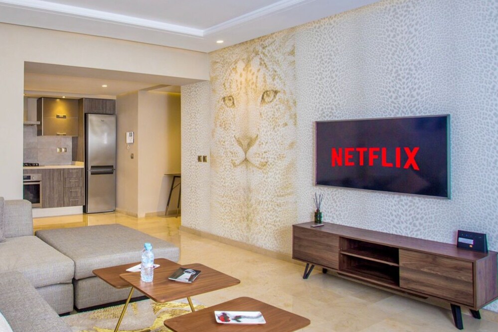 Welcome to your modern apartment in the heart of Casablanca Finance City (CFC) in BO52 residence. Perfect for tourism and business trips. This luxury fully-equipped home features: -WiFi & IPTV -Private gym -Spacious dual aspect terrace -Central A/C & heating -Fully equipped kitchen -Free secured parking -Tram & transport access Prime location: facing Aeria Mall and Anfa Park, 10 minutes from Ain Diab beaches . Secure, prestigious neighborhood for an unforgettable stay in Casablanca.