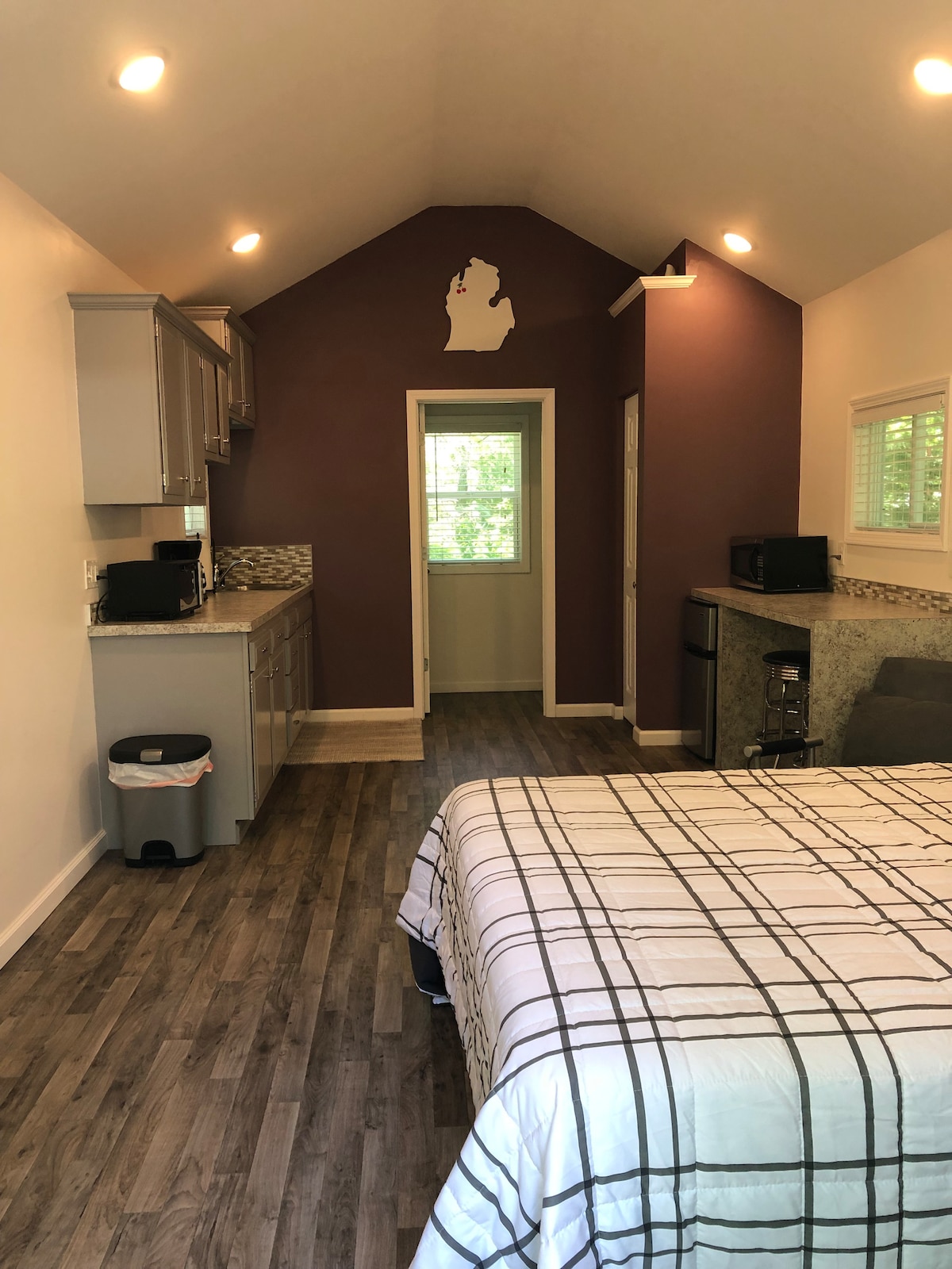 Elegante habitación en el precioso y céntrico Leelanau, bullicioso pueblo del lago Leelanau, cerca de Leland. Nuestra casa de huéspedes es luminosa y con vistas a la belleza de los jardines desde un espacio cálido y acogedor. Damos la bienvenida a los visitantes y esperamos que encuentres comodidad en nuestra pequeña casa ecológica que funciona con energía solar. Un gran sofá cómodo, una cama loft acogedora, sábanas suaves, ducha a ras de suelo, mininevera. Excelente ubicación en la carretera principal en el centro del pueblo, a poca distancia a pie de bodegas, restaurantes y tiendas de comestibles. ¡Base perfecta para relajarse y explorar!