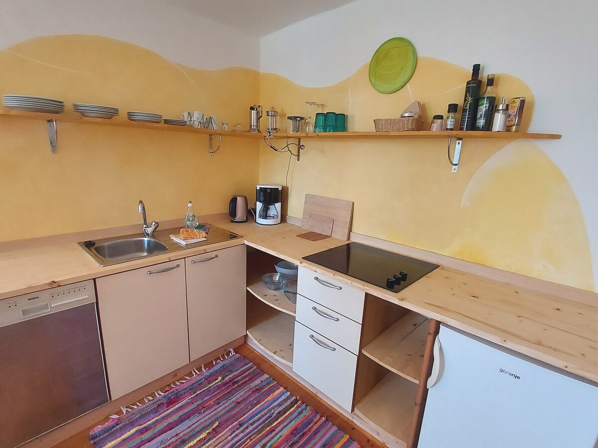 Apartamento de una habitación con una ventana, situado en la planta baja en el camino a pie al Castillo de Tirol. (Los residentes pueden conducir por el camino). Cocina americana totalmente equipada con vitrocerámica, lavavajillas, microondas y nevera. Uso de la terraza en el piso superior con una hermosa vista panorámica. Servicio de panadería y/o desayuno (se cobrará por separado). Céntrico, punto de partida para grandes caminatas y otras actividades Hablamos alemán, italiano, inglés