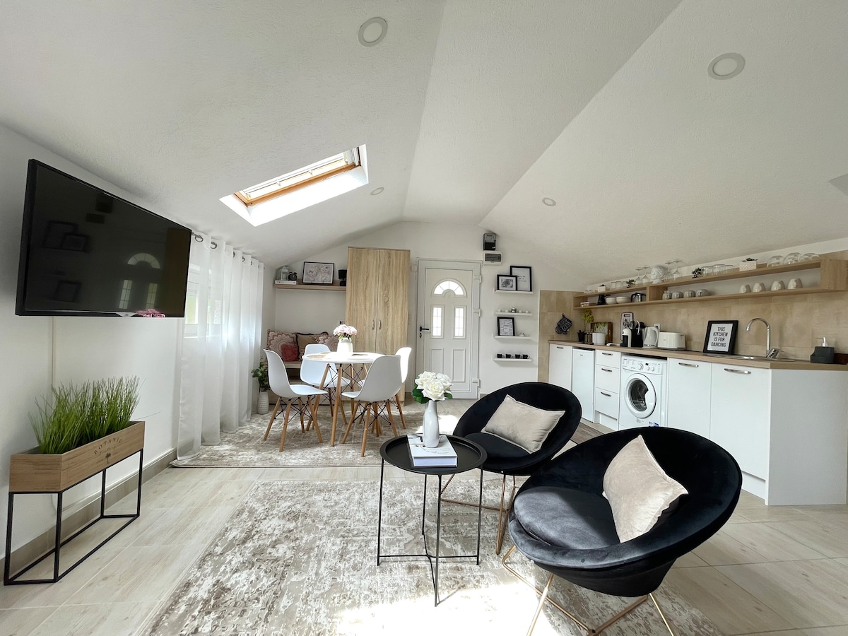 Recién terminado, estudio nuevo con cocina y comedor separados, construido para fines vacacionales. Todo es de alta gama, con materiales y estándares de alta calidad, hecho a medida para adaptarse al espacio y propósito. Cama y colchón de alta calidad, último mecanismo de sofá cama con colchón de tamaño completo, iluminación ambiental, cocina moderna totalmente equipada, baño de alta gama con azulejos italianos y ducha a ras de suelo , y amplio balcón con vistas al jardín orientado al sur con mucho sol.