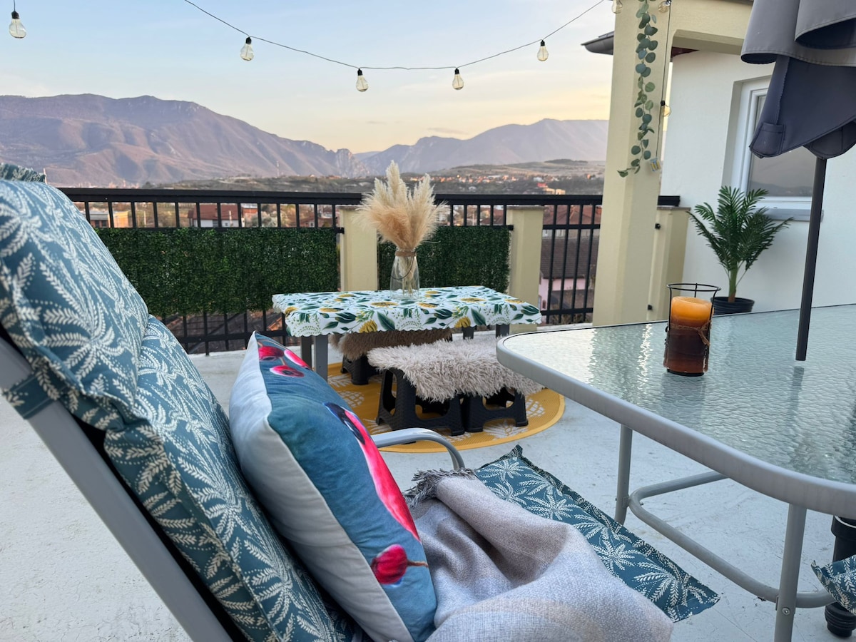 Stay in style close to nature with a 35 m² private rooftop terrace offering panoramic views of Matka Canyon. Enjoy morning coffee in the sun and peaceful evenings under the open sky. Spacious home across 3 levels with a bright 65 m² living area and open kitchen. 2 bedrooms (1 Queen bed) (3 single beds), modern bathroom, extra toilet upstairs, and private garage. 10 min to Matka, 12 min to Skopje center.