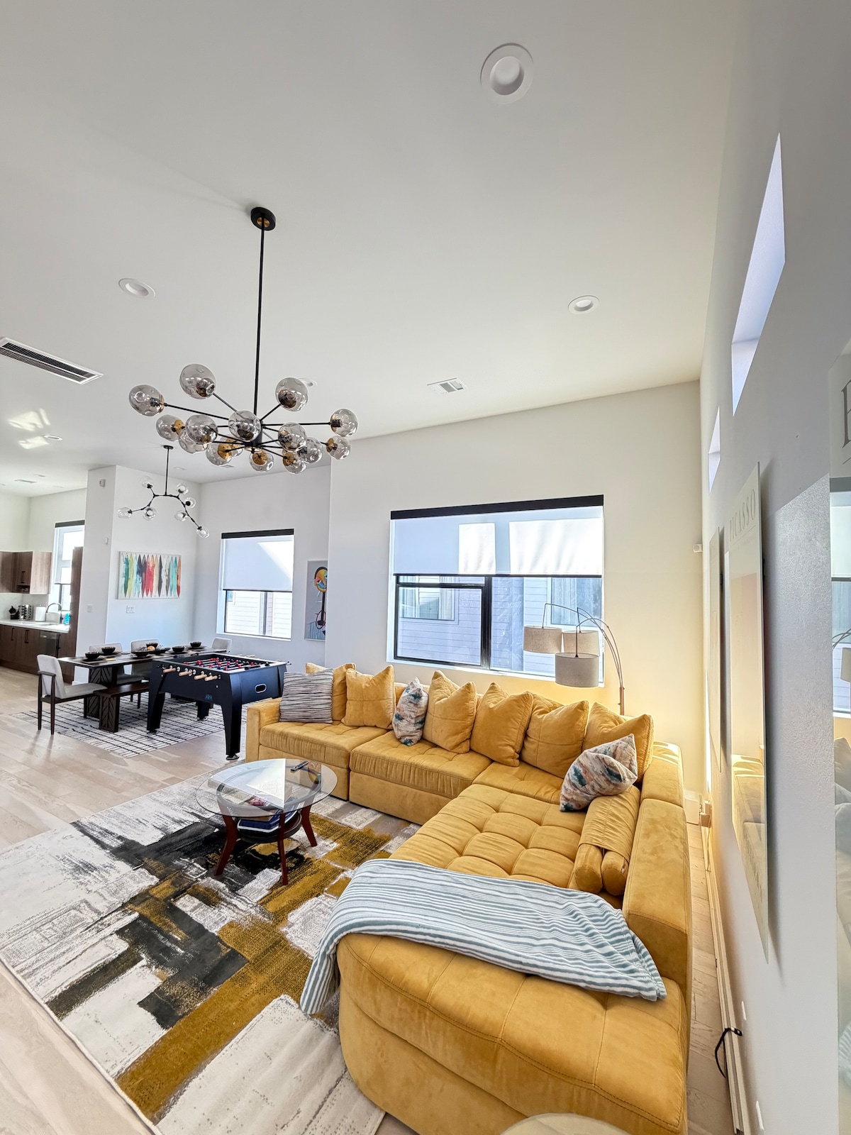 Disfruta del lujo en esta casa adosada de Houston con 3 dormitorios, cada uno con baño privado y TV. La casa inteligente tiene cerraduras automatizadas, luces, aspiradoras y termostatos. El segundo piso es un espacio de concepto abierto con cocina, comedor y sala de estar con TV Samsung de 85 pulgadas, mesa de billar, juegos de mesa y minibar. Hay una pequeña estación de trabajo en el dormitorio de abajo y un espacio de oficina con una configuración de trabajo completa. Disfruta de la zona de estar del patio trasero. Situado a menos de 5 millas del estadio NRG y del parque Minute Maid.